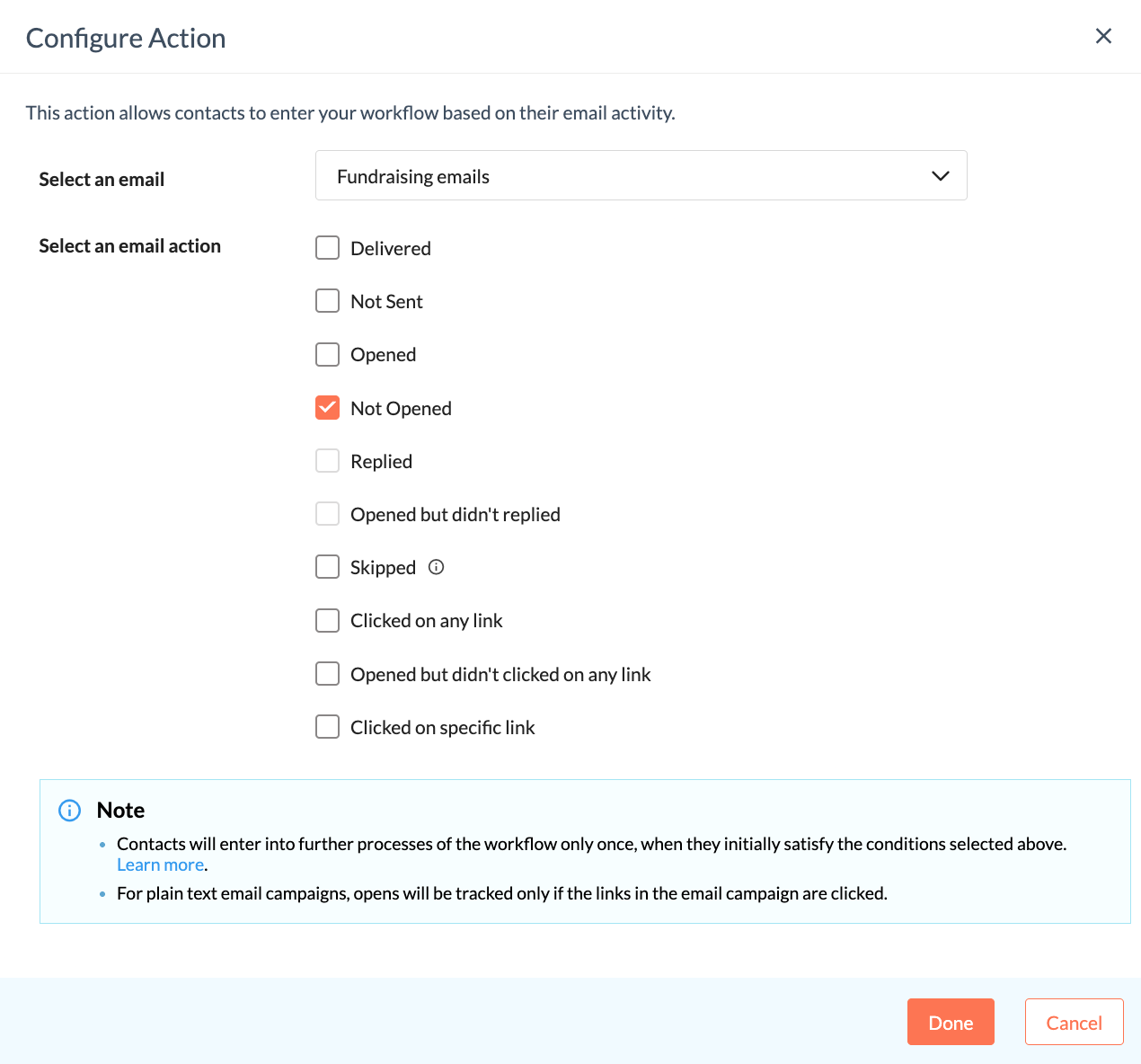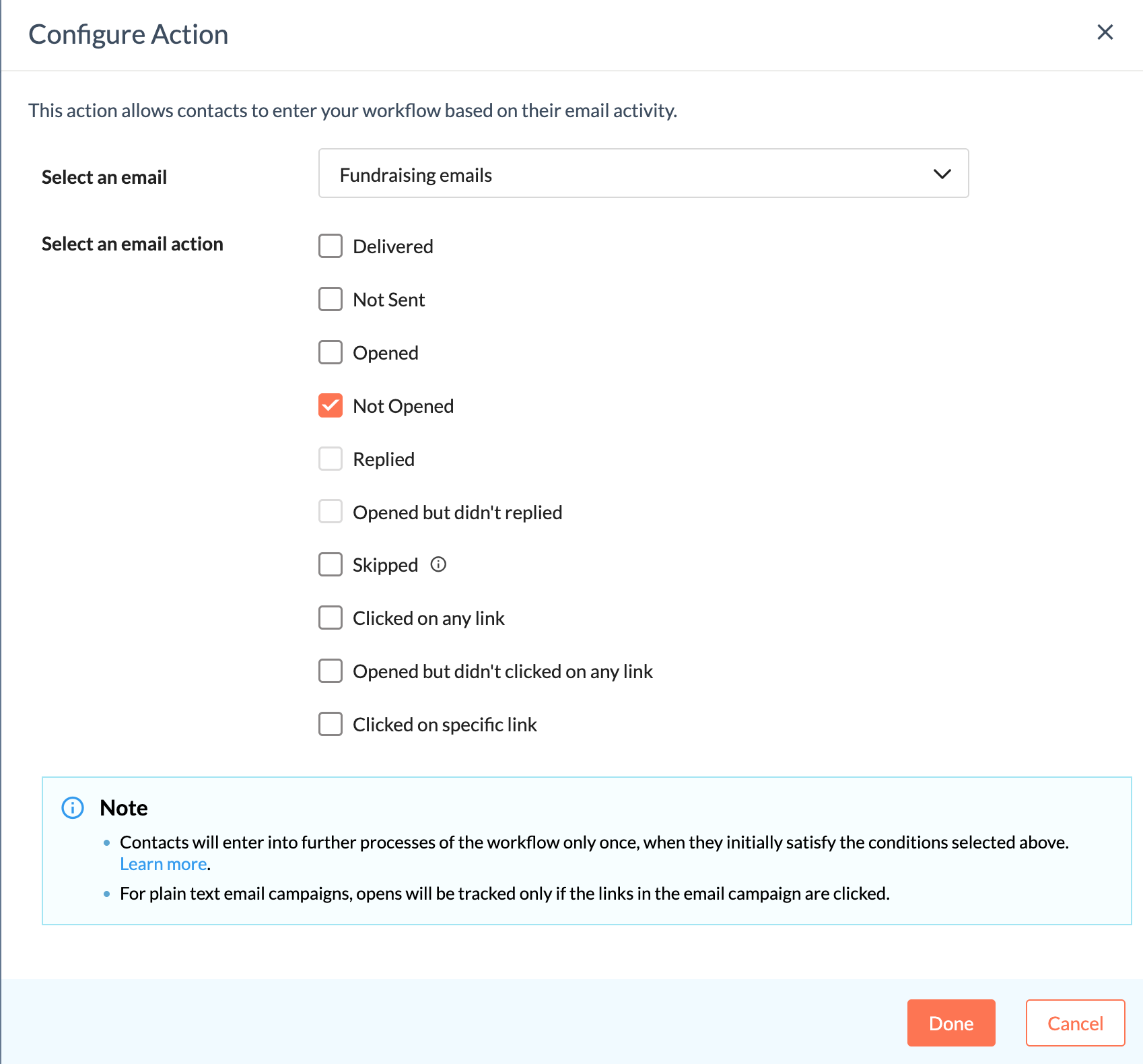 - Add the Email Activity condition and configure it to check for un-engaged behavior, such as contacts who have not opened or clicked a selected campaign over a specific period. This helps accurately identify contacts who are no longer interacting with your emails.