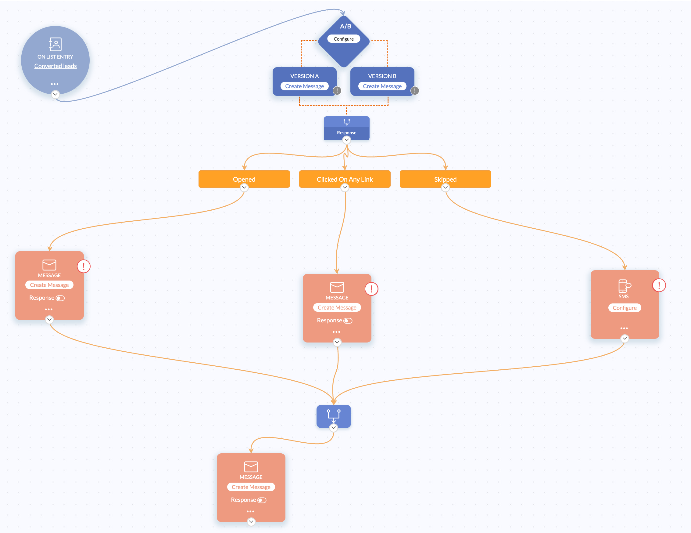 - After the final step in each path, add a Merge component to bring all contacts back into a single flow.