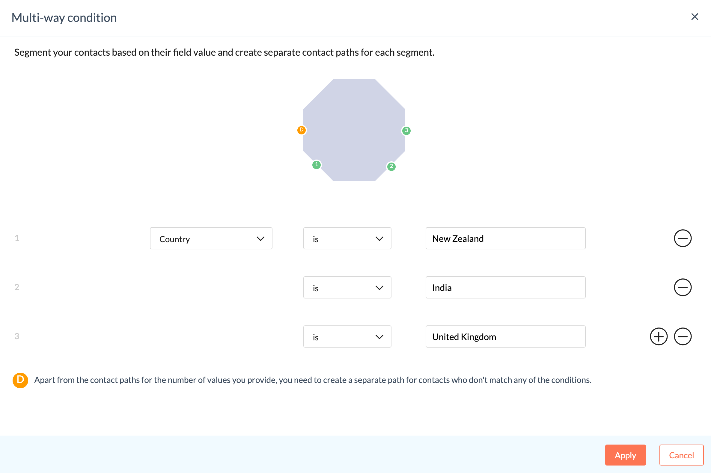- After the trigger, add a Simple Condition or a Multi-way Process component and choose the location-based field, such as country, state, or city.