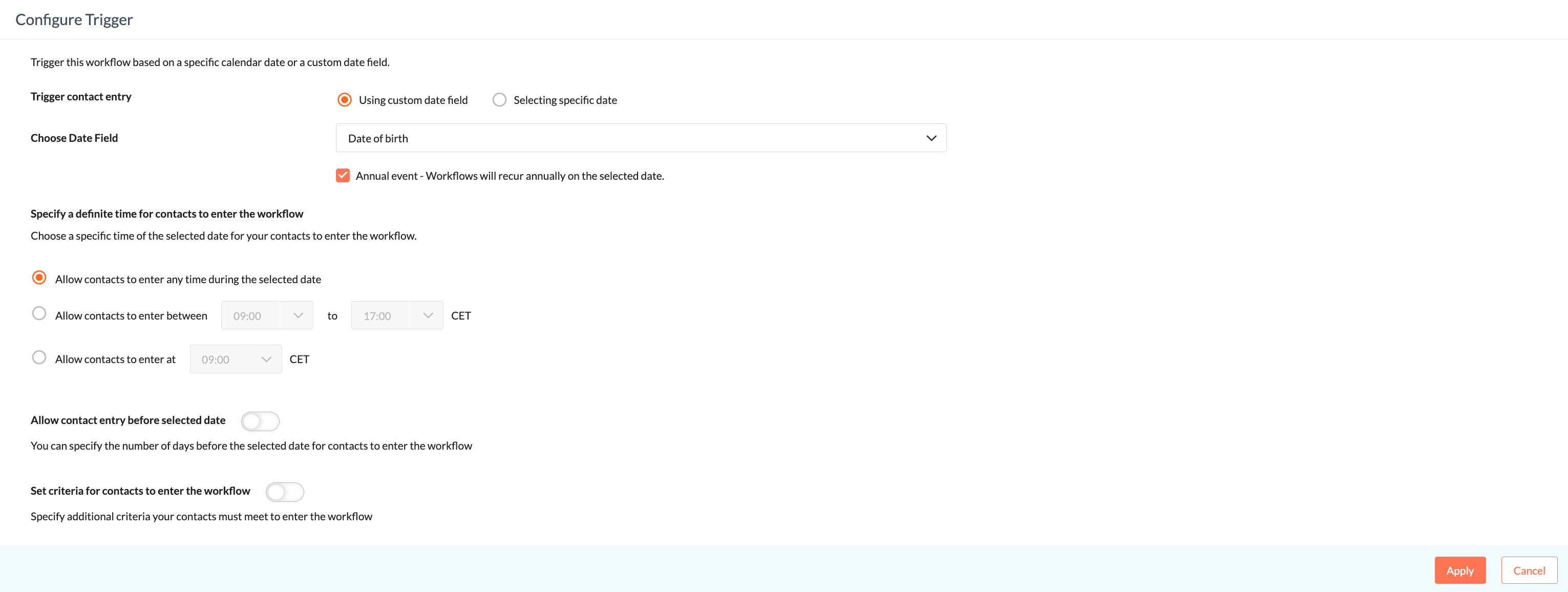 - Using the Date Field trigger allows the workflow to run automatically based on a specific date stored in a contact’s profile. By selecting the “Date of Birth” custom field, the workflow will be scheduled to activate every year for each contact on their birthday.