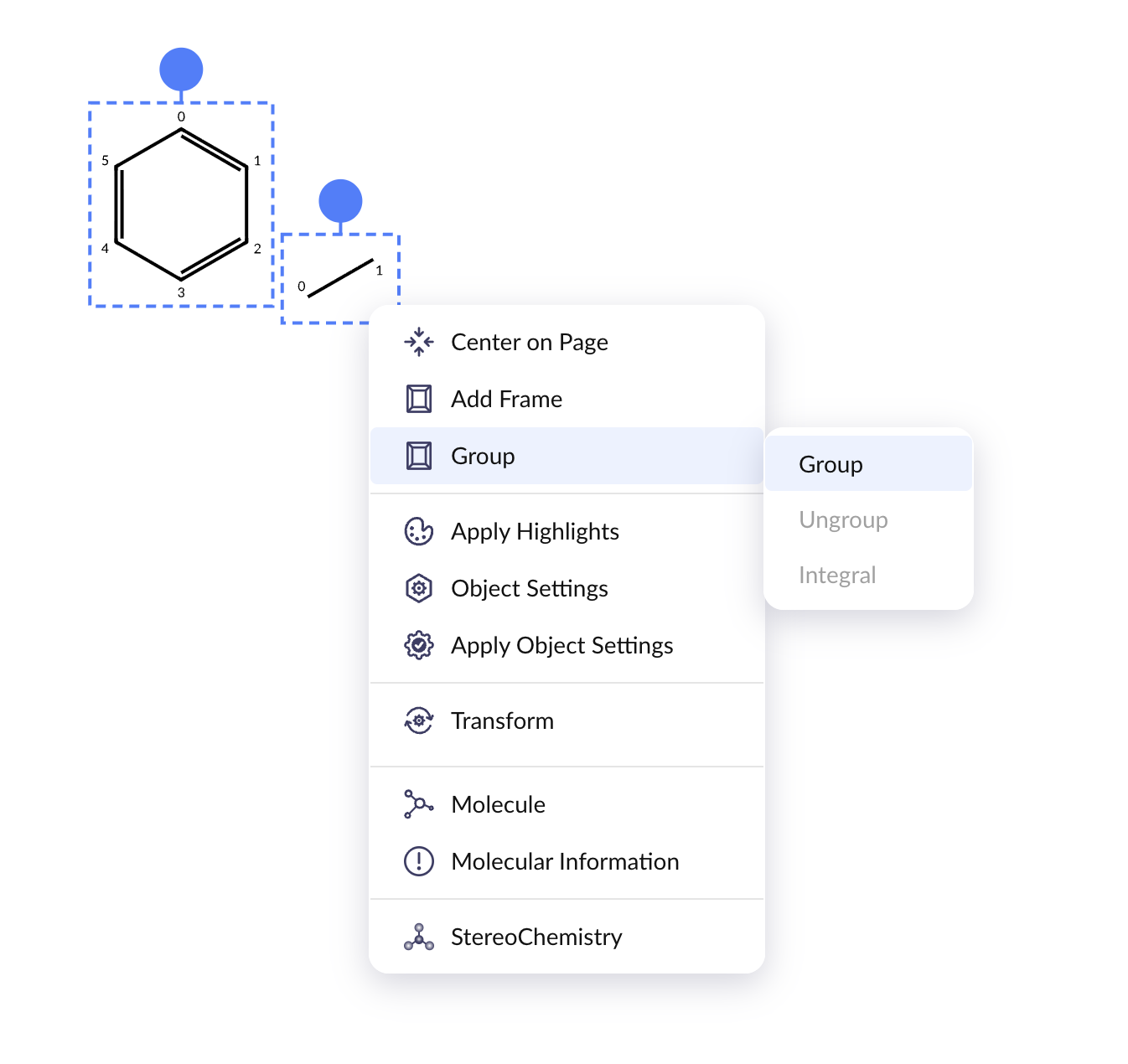 - Group- Combines selected molecules or objects into a single movable and editable unit.