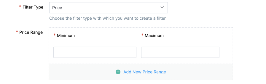 You can set filters based on pricing ranges. Set minimum and maximum price ranges. Click Add New Price Range to add more price ranges.