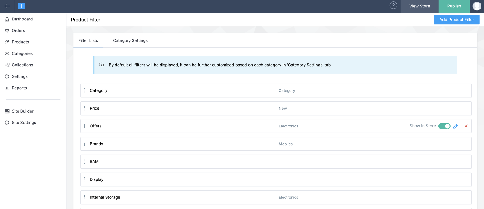 The order of the filter can be rearranged for each category specifically. Select the specific category from the dropdown list. You can drag and drop the filters to rearrange them.
