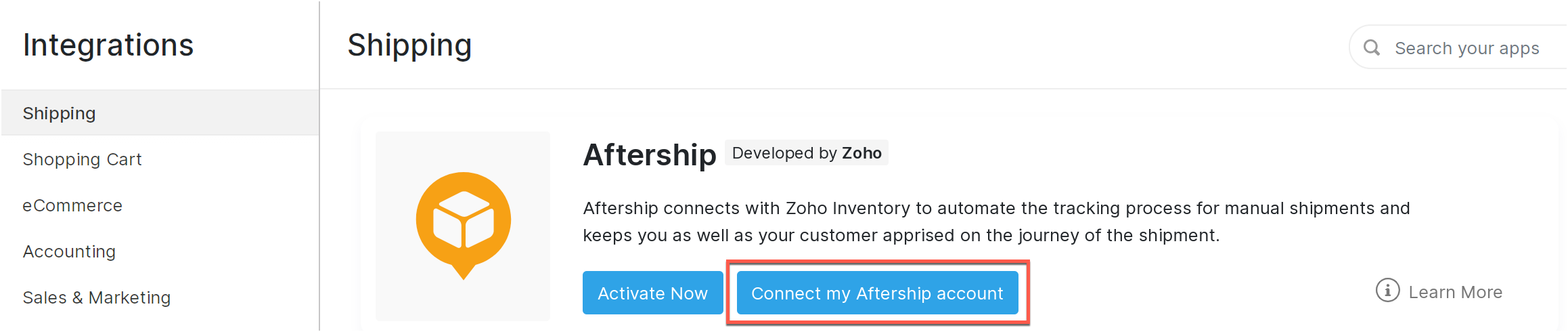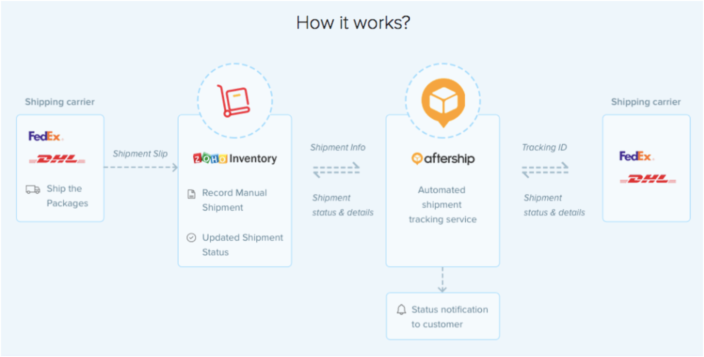 Upon tracking a shipment in Zoho Inventory, details such as your contact information, your customer’s contact information, the shipment details, and your shipper account number (for selective carries) will be shared with AfterShip. In this case, you and your customers will receive all shipment-related updates directly from AfterShip. Note that Zoho Inventory is not responsible for any information shared post integrating with AfterShip.