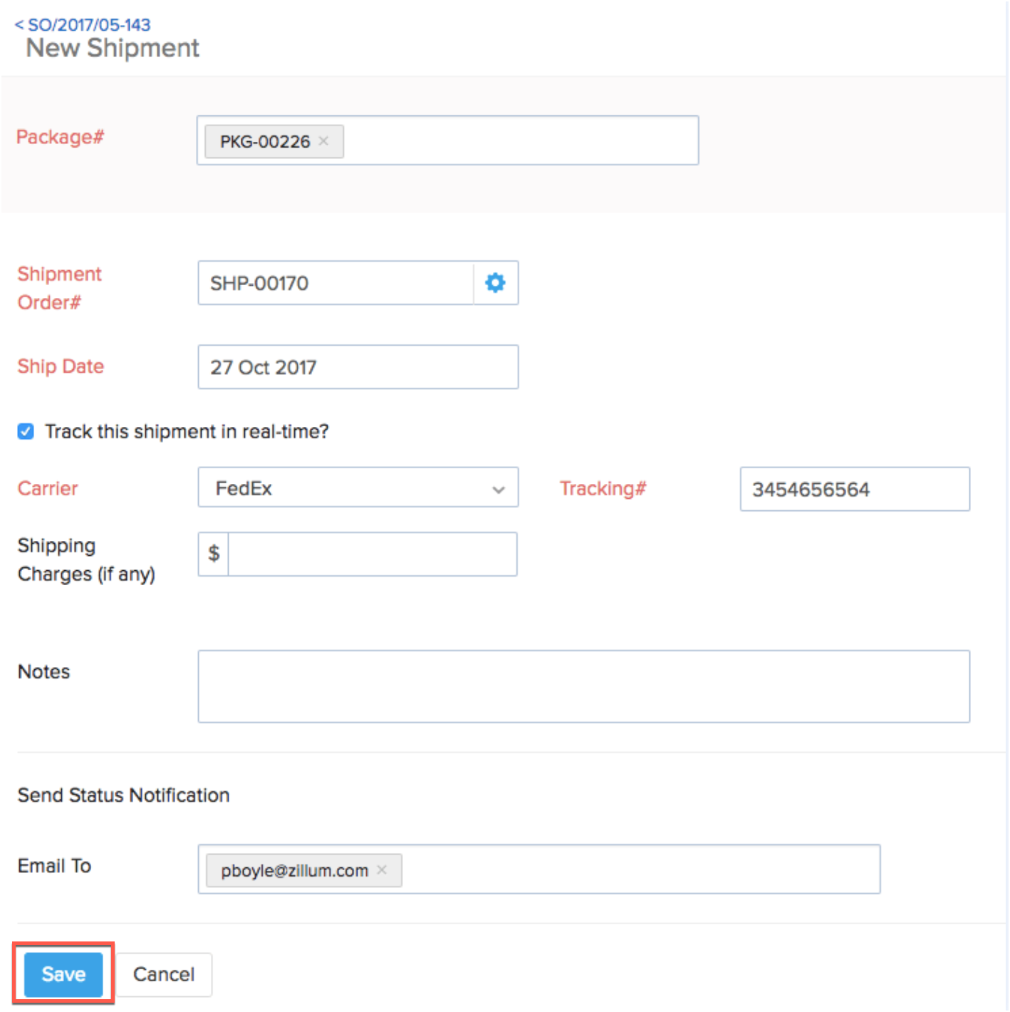 Fill in any other essential details and hit Save to create a package slip with the tracking ID and shipment details.