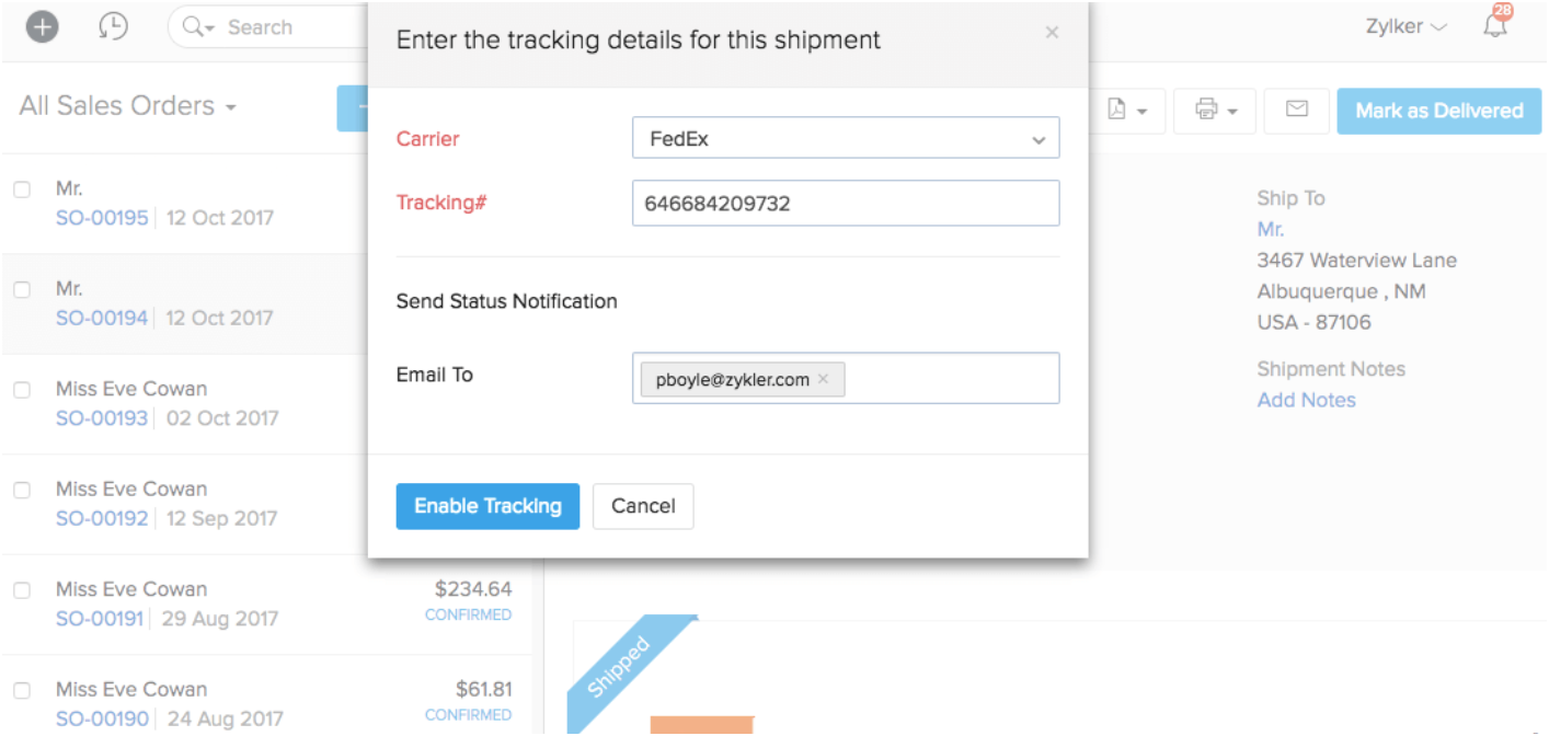 Zoho Inventory shares only the shipment tracking ID, carrier name and shipper account number (for selective carriers) with AfterShip. In this case, you'll receive all shipment-related notifications via email through Zoho Inventory and not AfterShip. This will help safeguard the personally identifiable information of your clients.