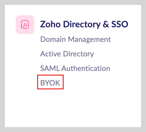 This is useful if your organization has strict security rules or compliance requirements that say you must manage your own encryption keys.Under Zoho Directory & SSO, select BYOK.