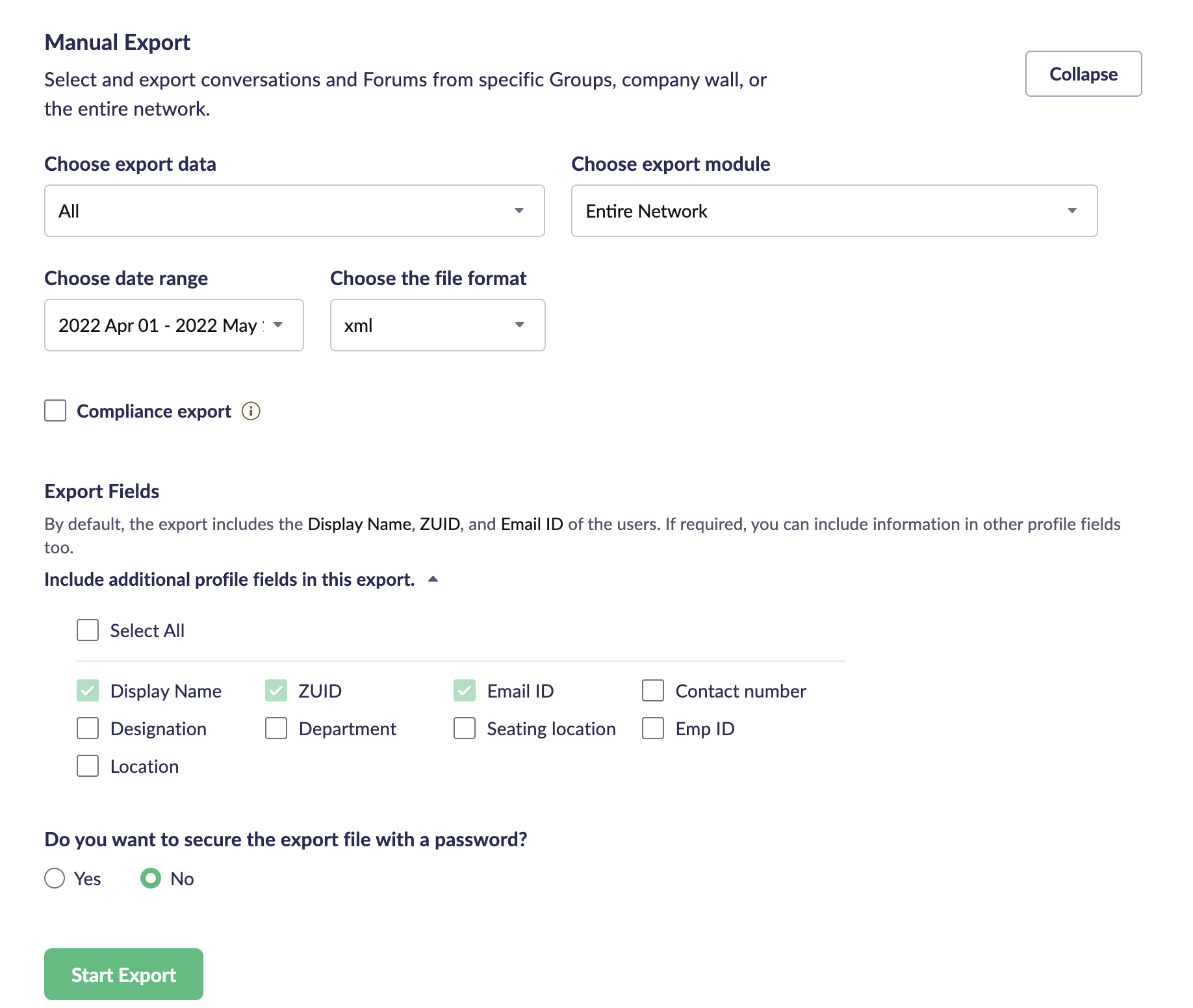 Export Module: Select from where the data should be exported (entire network, company wall, or a specific group).