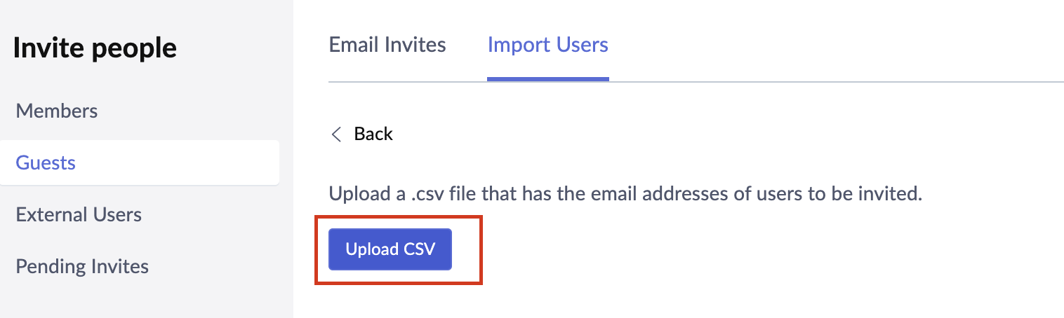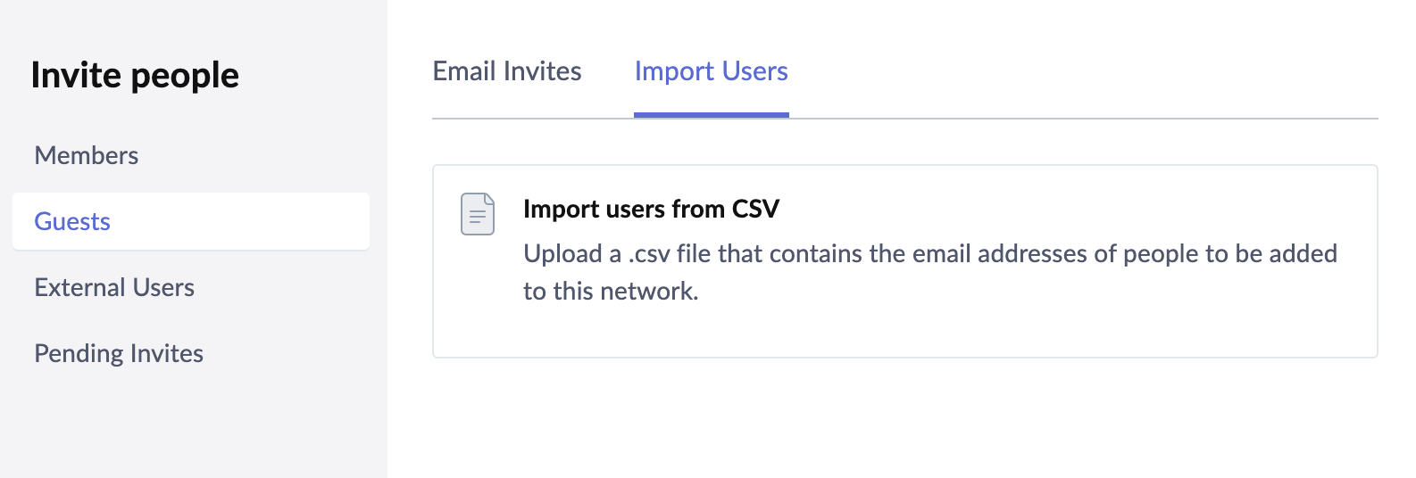 Zoho Connect supports inviting users in bulk using Comma Separated Values (CSV) files. You can import users by uploading a CSV file that contains the email addresses of users to be invited.