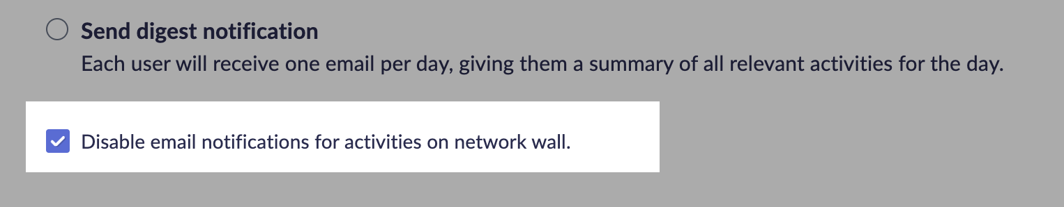 Network admins can choose to turn off email notifications for activities in the network wall.  However, users can still choose to receive email alerts for activities in the network wall from their notification preferences.