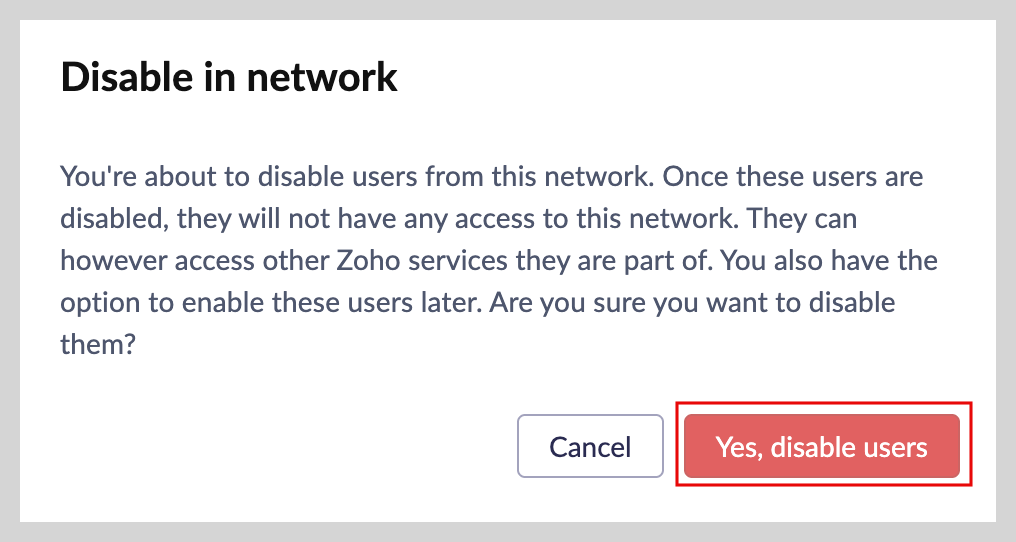 Disabling a user restricts access only to Zoho Connect. Their access to other Zoho applications remains unchanged.