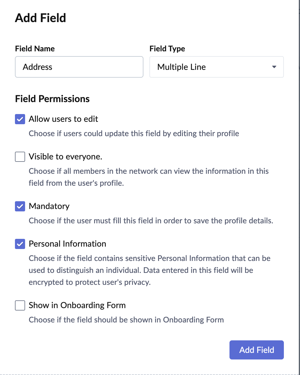 Show in Onboarding Form: The field will be shown in the onboarding form which the user has to fill out while joining the Network.