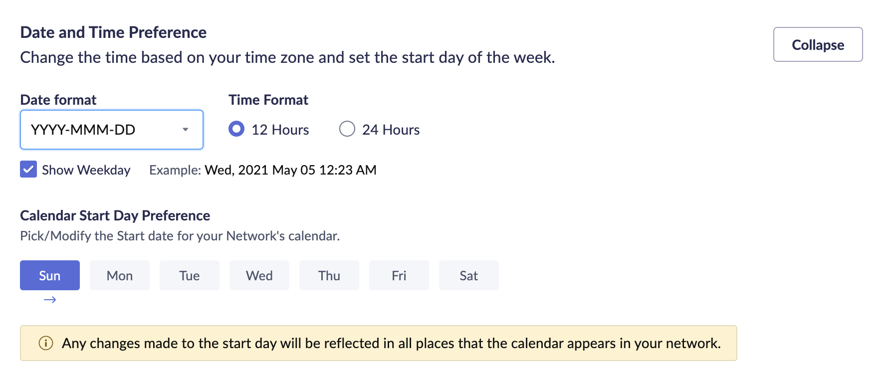 Once the start day is changed, it will be reflected in the event calendar and the date picker for all users in the network.