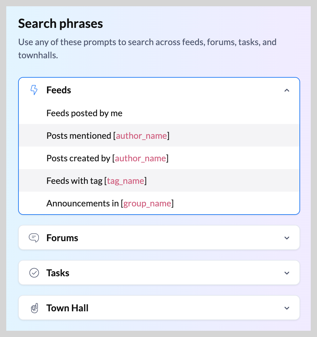 • Retrieves results from different modules (eg: Forums, Feeds, Town Hall posts, and Tasks)