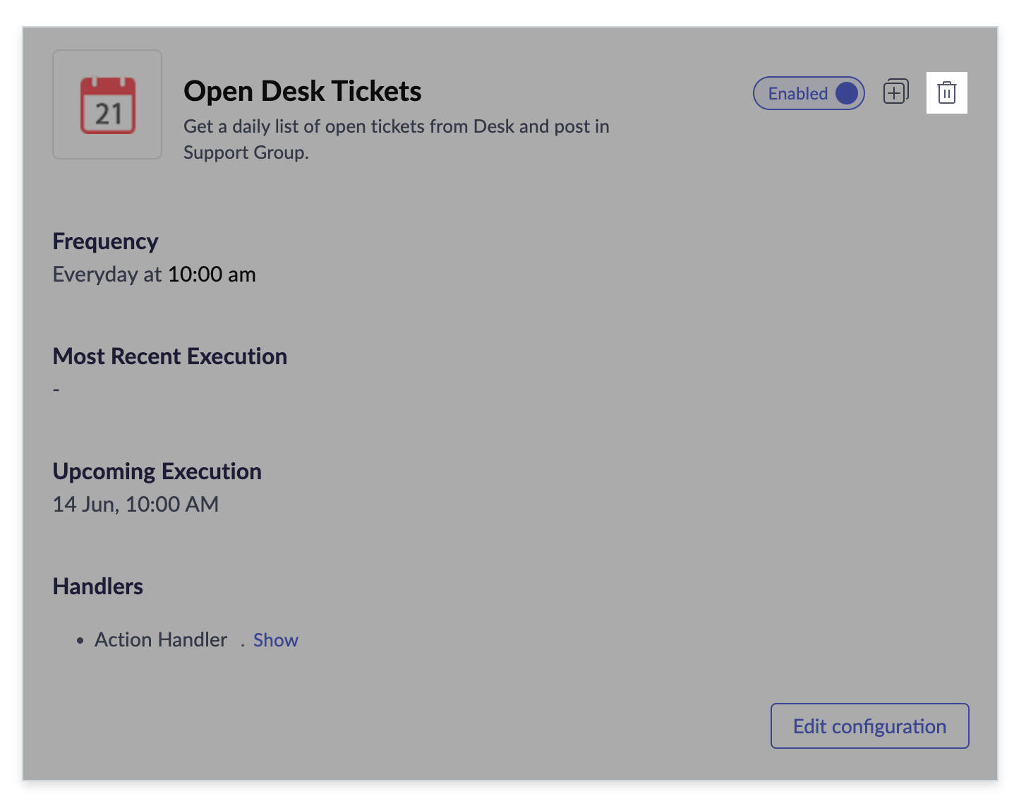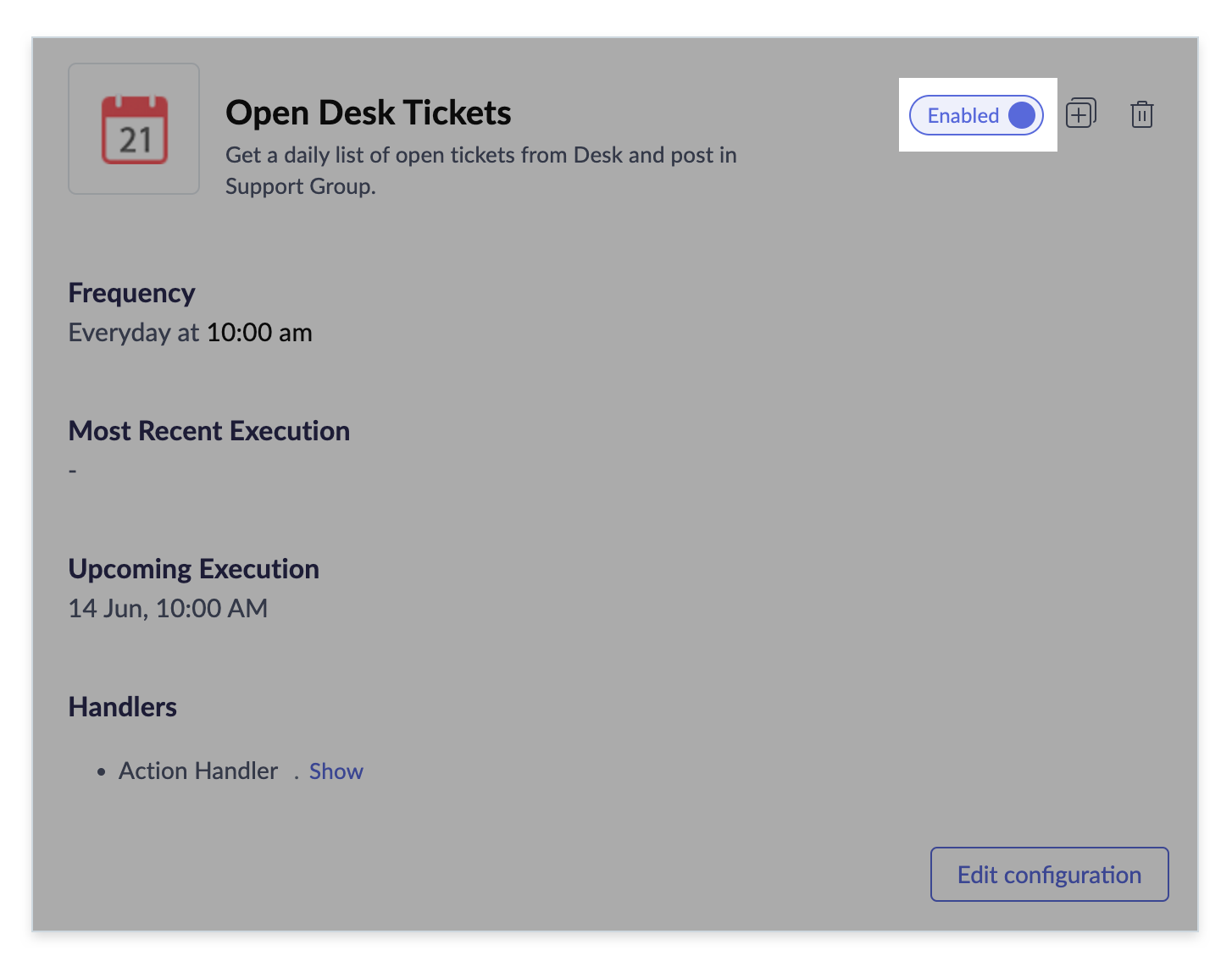 - To disable the scheduler, click the toggle in the top-right corner of the Configuration Details pop-up.
