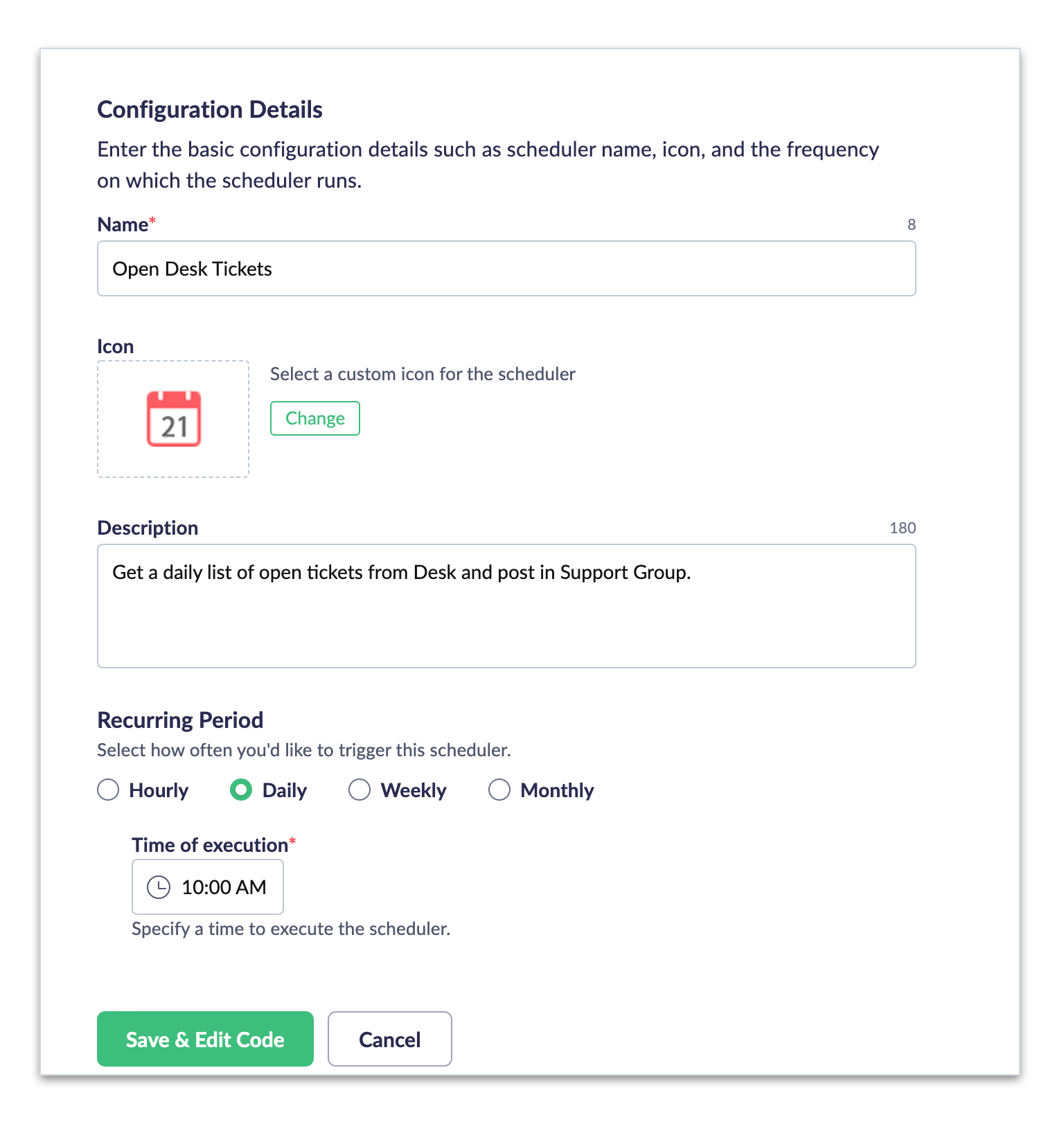 - Enter the scheduler name, description, icon, and set the recurring period.