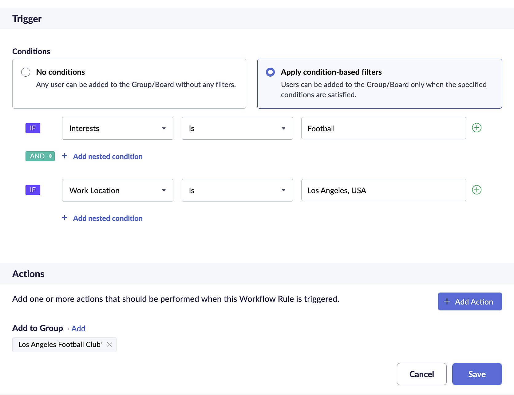 Let's say you want to add users who are working in your Los Angeles office and have football as their hobby to a group named 'Los Angeles Football Club'. Then, the rules and action for this case would be defined as follows: