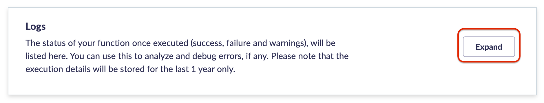 The logs in each Function API configuration lists the details of every request handler execution and its results for the past one year. The details include execution time, status, parameters passed, and the data returned by the function. These logs can be used to analyze and debug issues in the API execution.