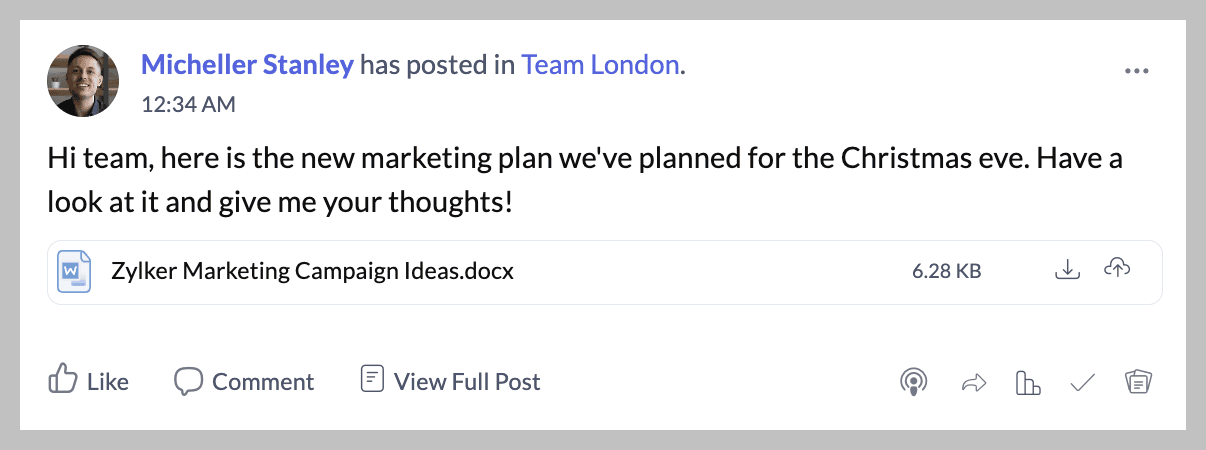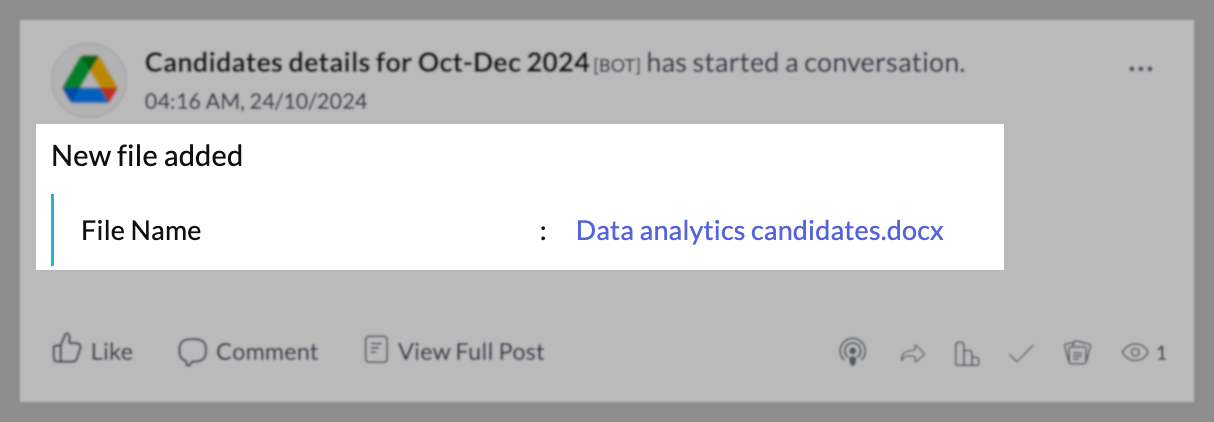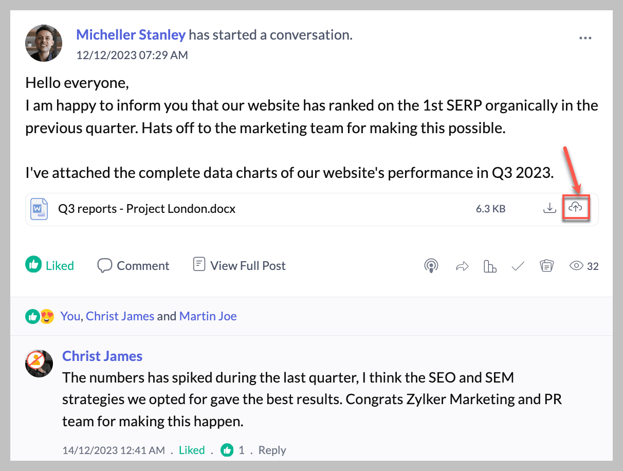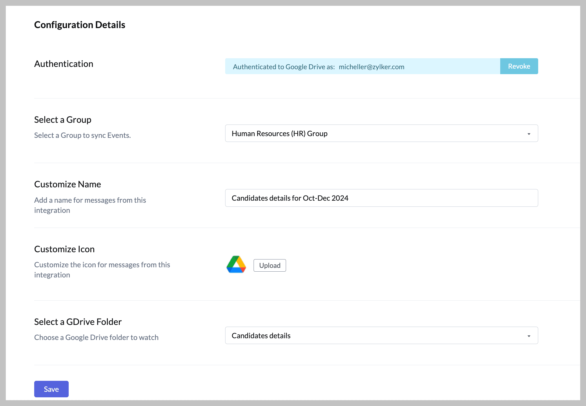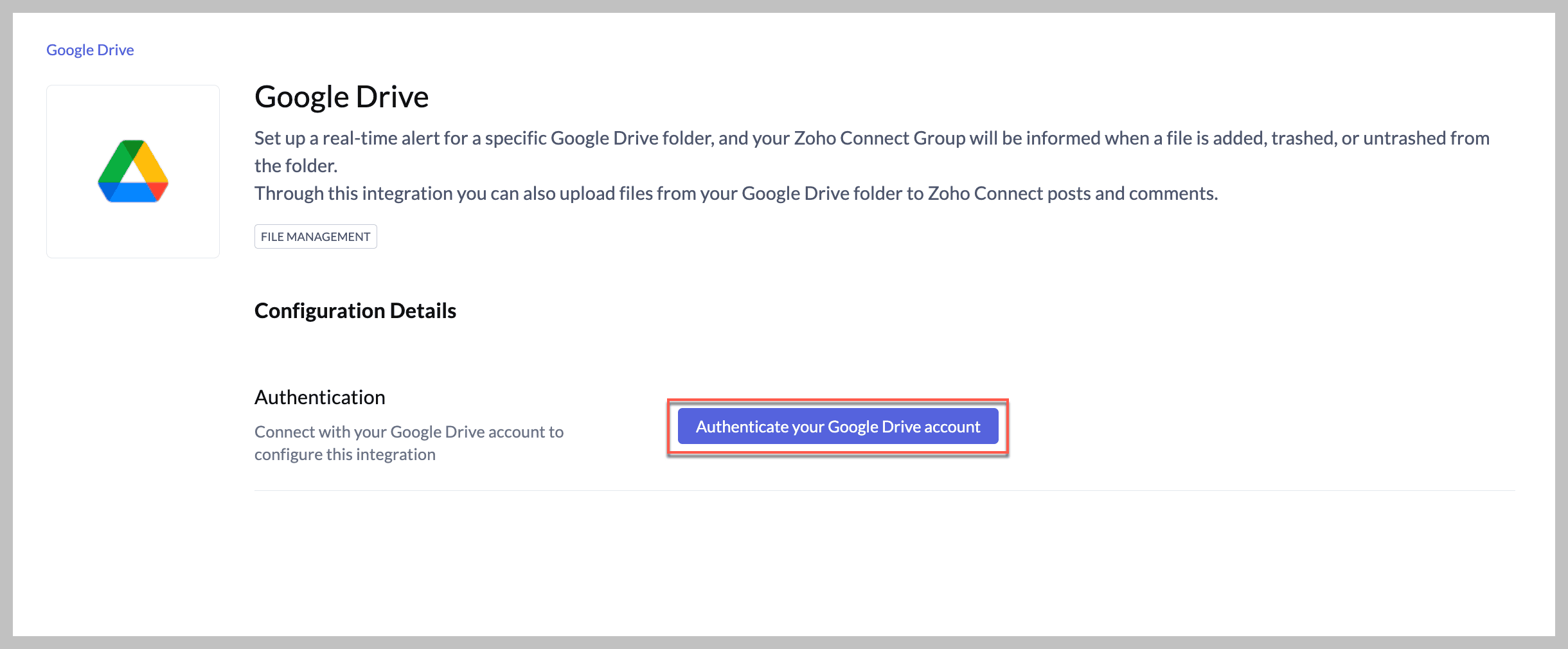 Watch our youtube video to learn how to configure and use Google Drive integration with Zoho Connect.