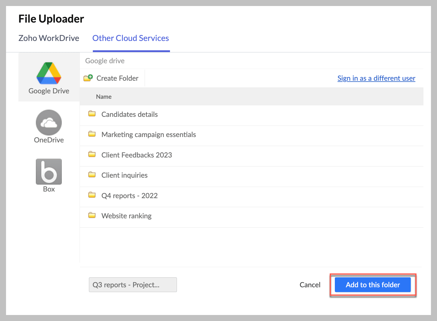 You can also create a folder in drive from here by clicking Create Folder on the top left.
