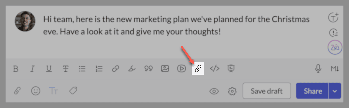 To add files to your posts from Google Drive, click the clip icon in the editor console.