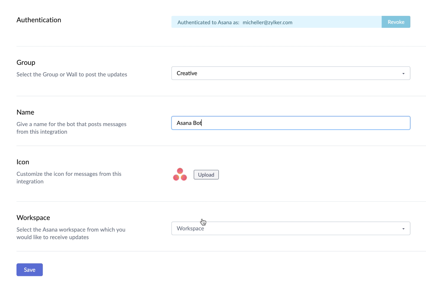 1. You will receive instant updates in the selected Zoho Connect Group whenever a task is created, assigned to someone, completed, or commented on in Asana.