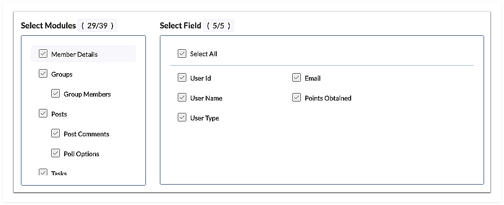 - Select the data modules and fields you want. There are 39 modules available, such as posts, groups, tasks, boards, and member details. In default, 29 data modules will be added to the list.