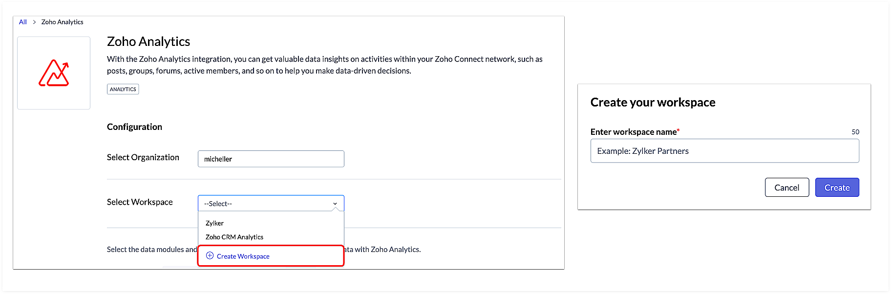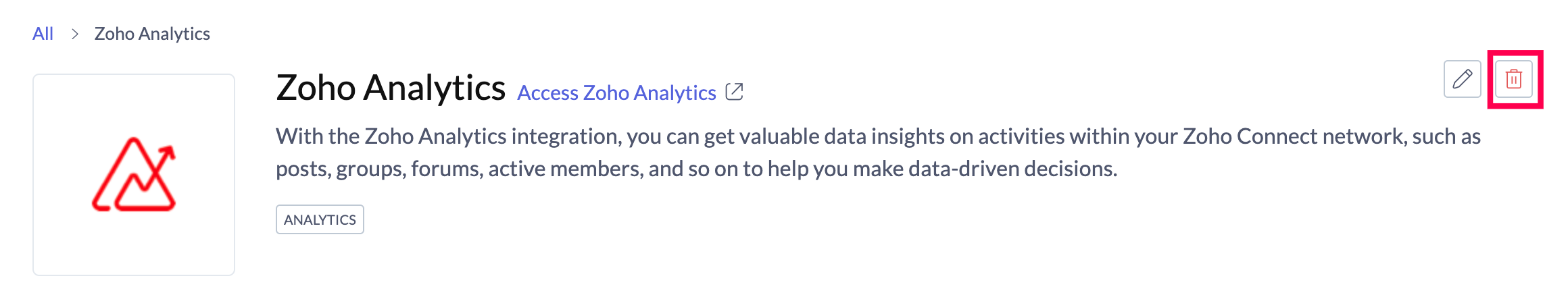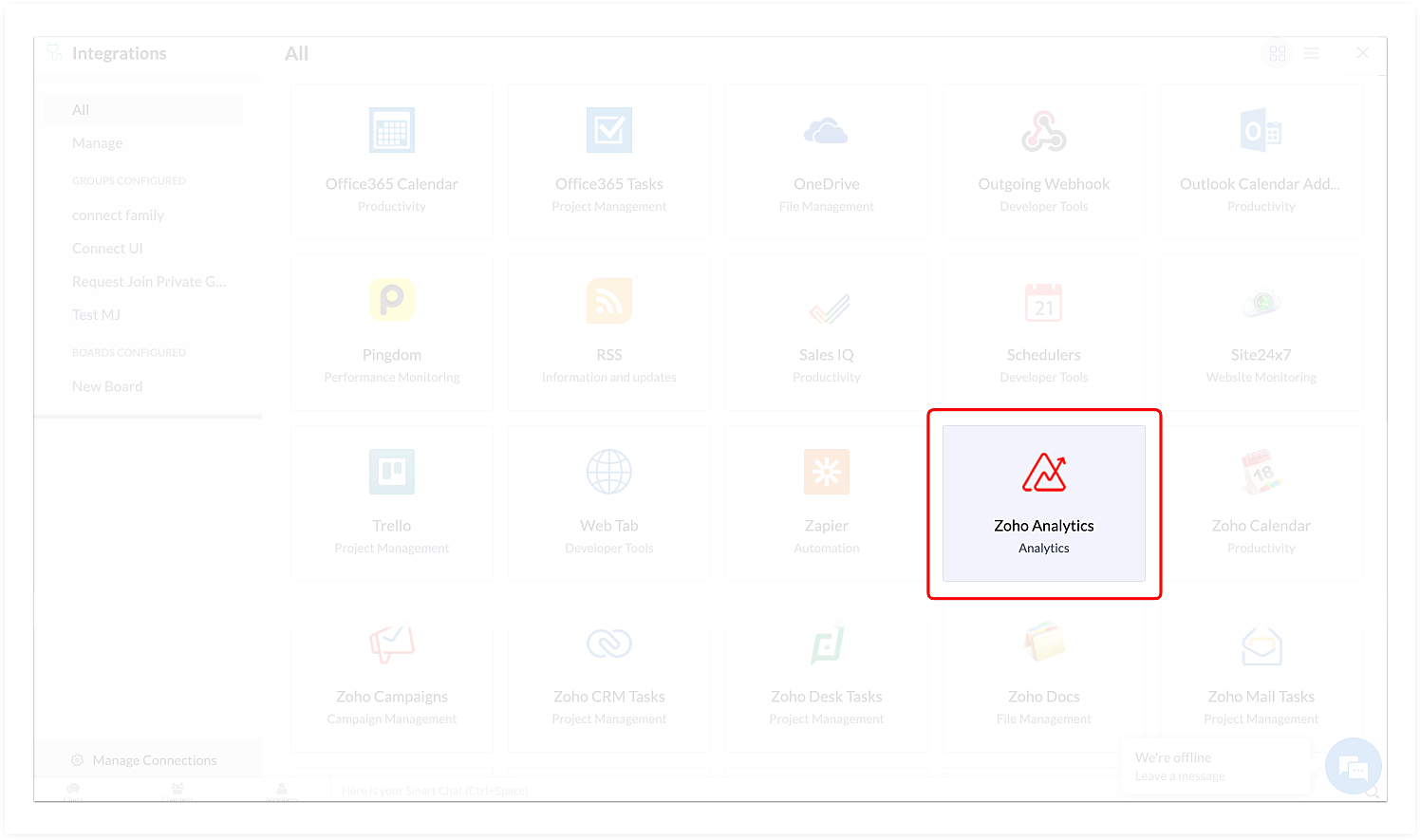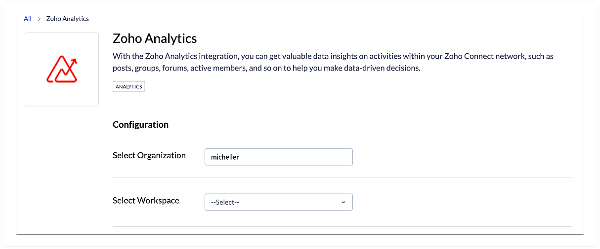 ] from the vertical menu in the top-right corner of the Zoho Connect page. From the list of integrations, click Zoho Analytics.