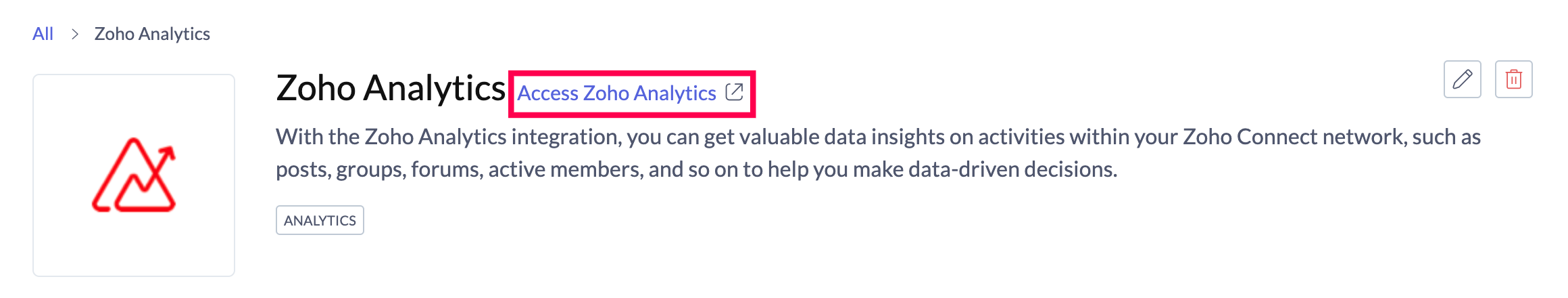 Once the integration is enabled, the admins of Zoho Connect will be able to access this integration. Only admins can access Zoho Analytics by clicking the Access Zoho Analytics hyperlink in the header section.
