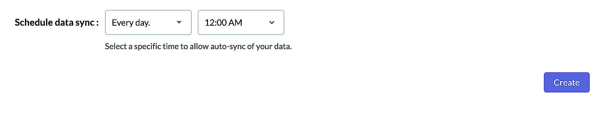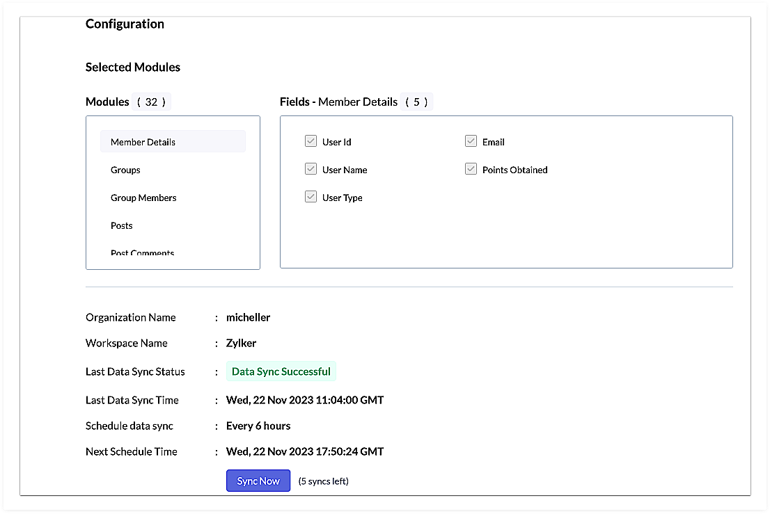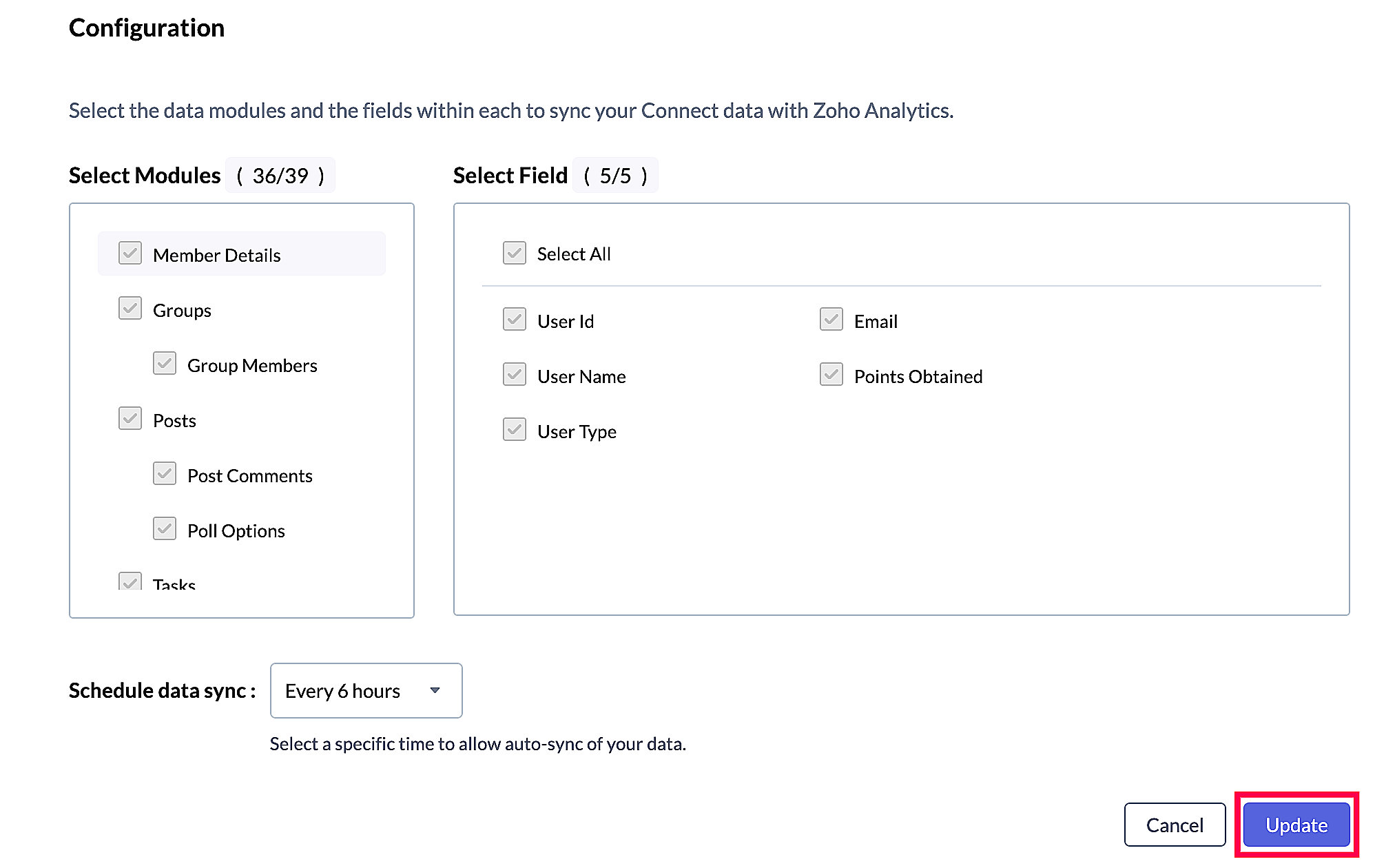 - After selecting the modules, enable auto-sync of your Connect data with Zoho Analytics by choosing a specific time and interval from the dropdown.