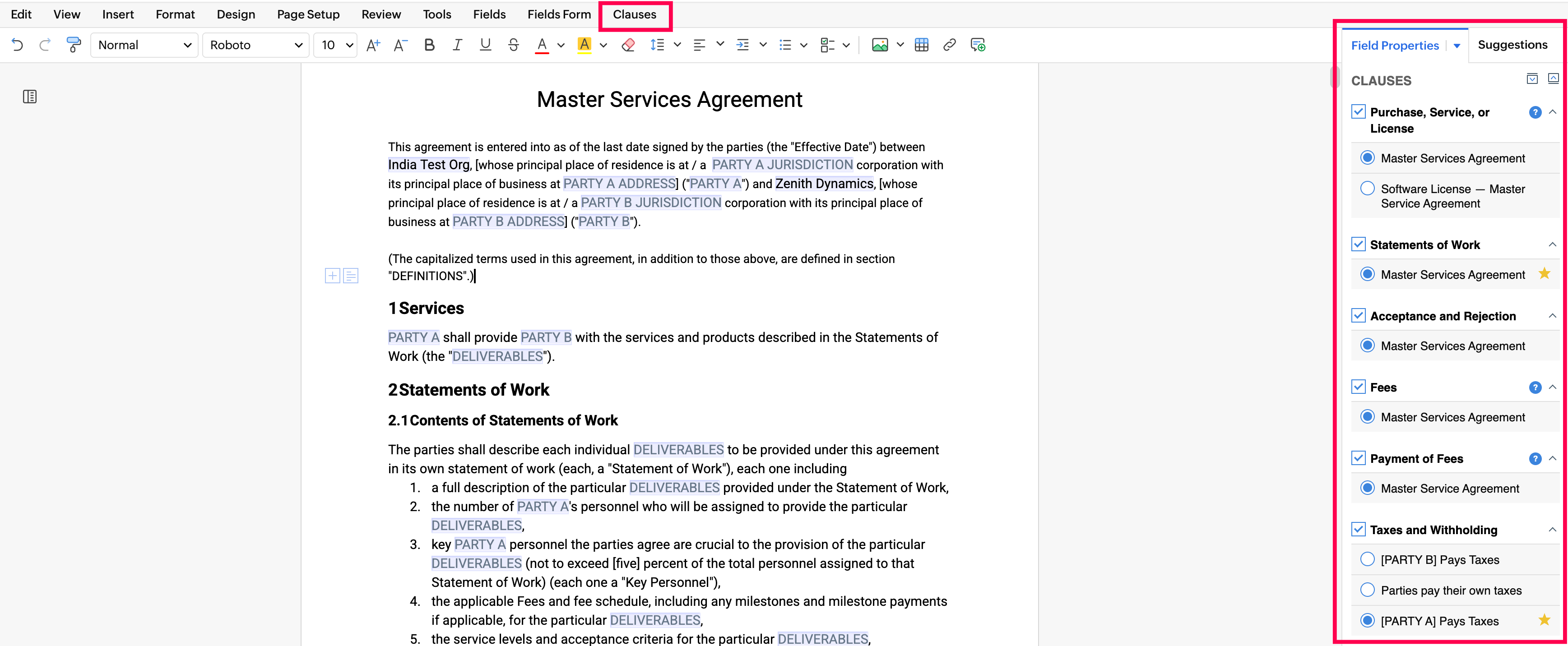 In Zoho Contracts, each clause contains a standard language, and can also have alternative languages. When you associate clauses with a contract type template, they will display in the document editor at the time of contract authoring. The contract owner can pick the clauses that are needed for the contract.