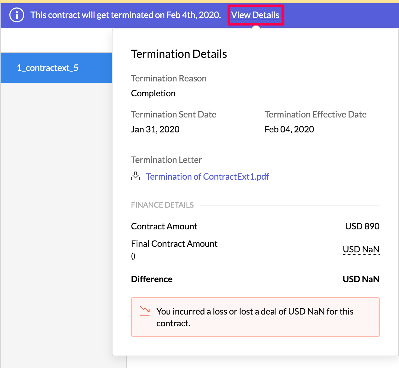 Note: When the contract owner schedules the termination for a later date, an alert message will be displayed in the contract details page. Click View Details on the alert to view the termination details.