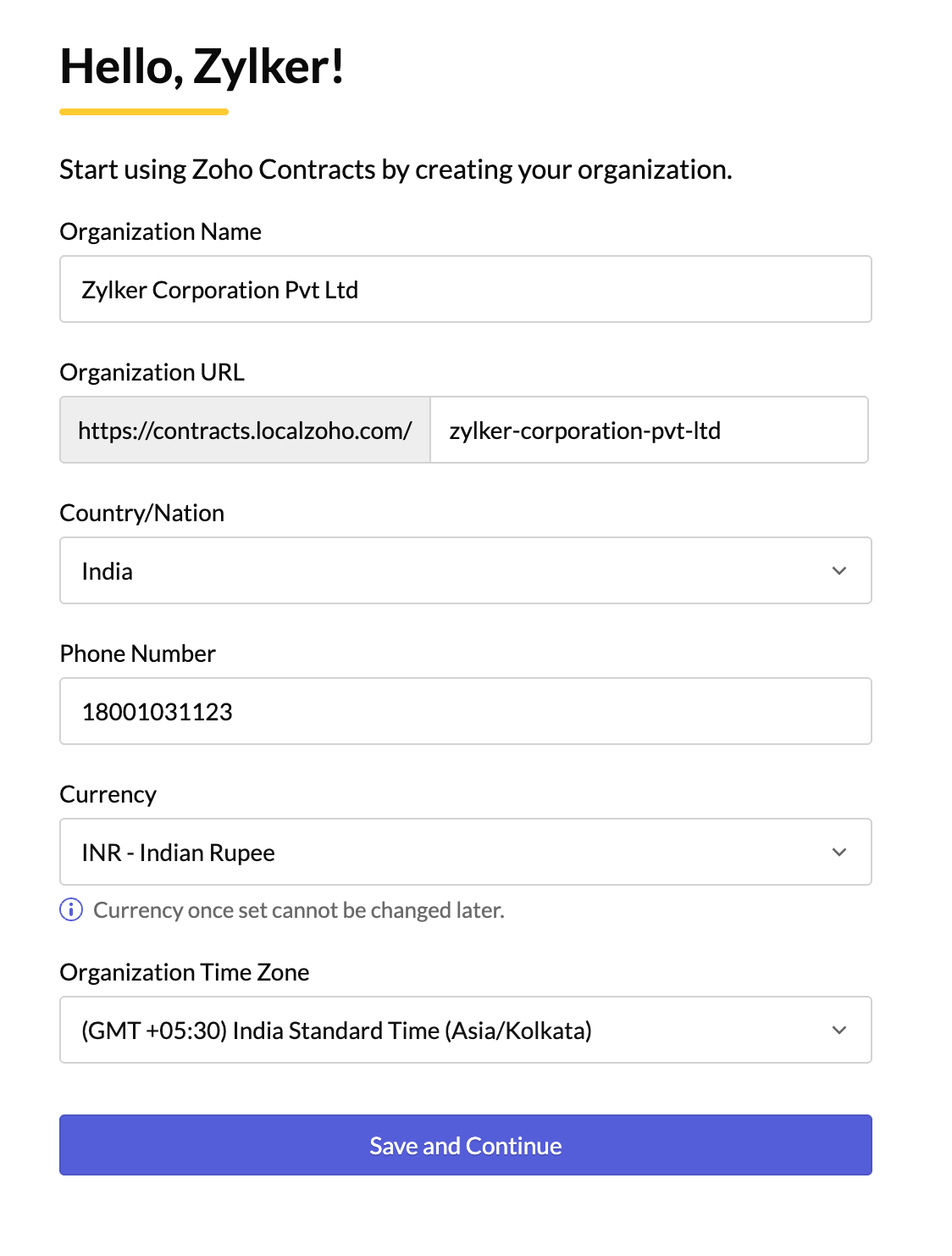 A user who has signed up for a Zoho Contracts account must create an organization as the first step for which they have to create and manage contracts. So, by default, they will have an organization created in Zoho Contracts.