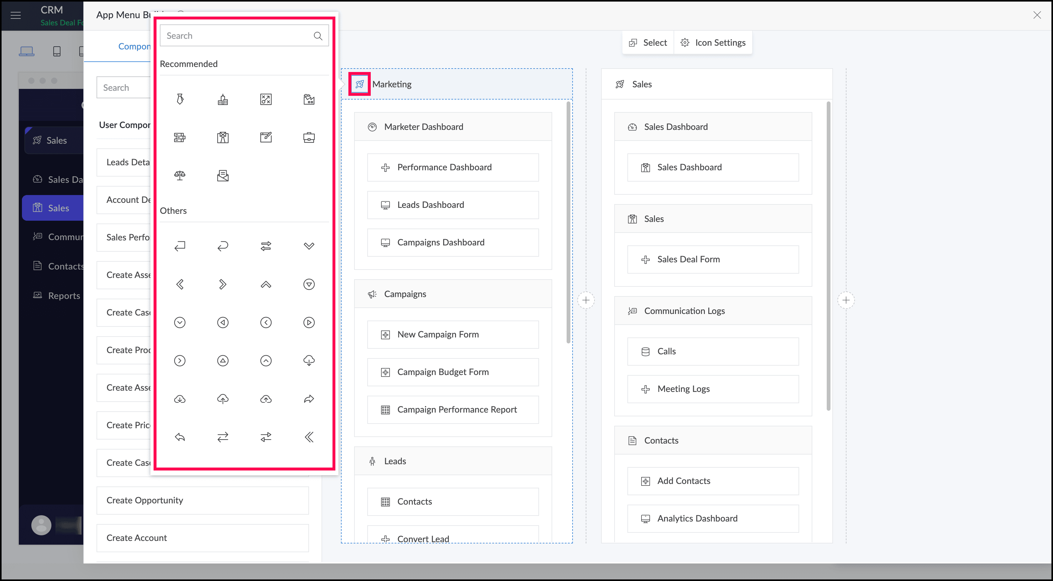 3. To change an icon, click on the icon next to the space, menu, or sub-menu and select the preferred icon from the pop-up to update.