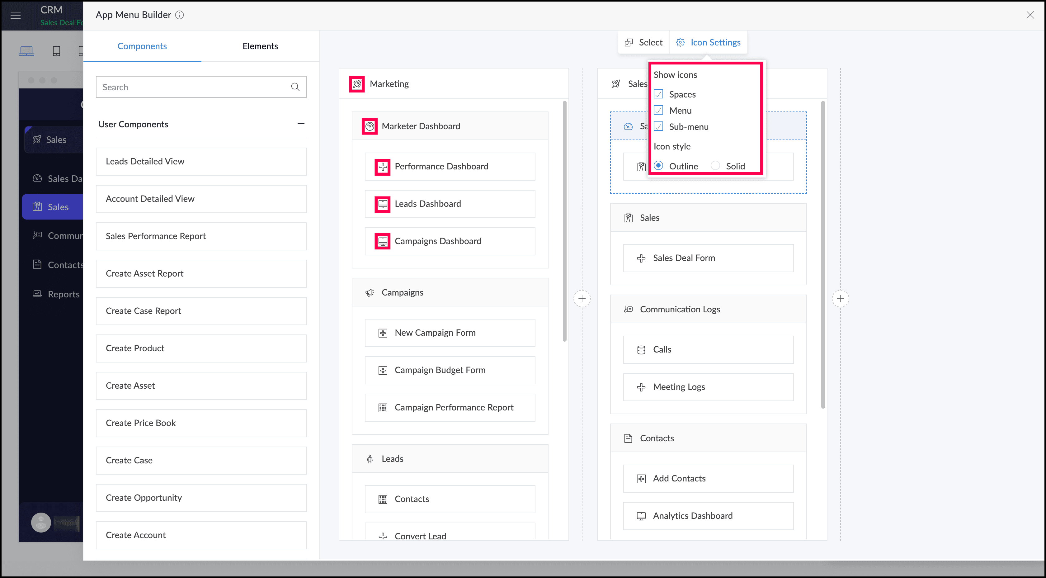 2. Click Icon Settings and check the preferred checkboxes to show icons for the Menu, Sub menu, and Spaces. You can also choose your preferred icon style, either solid or outline.