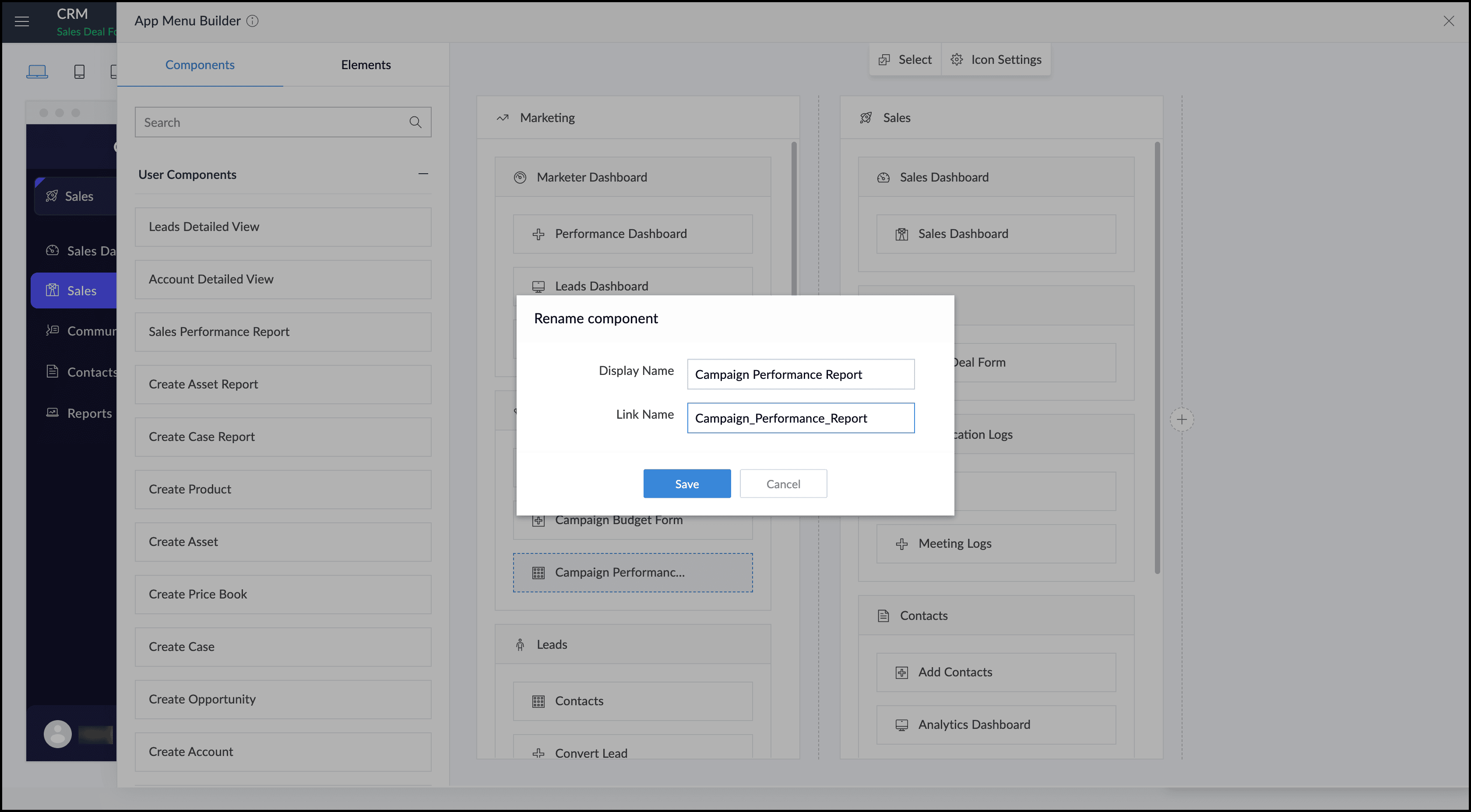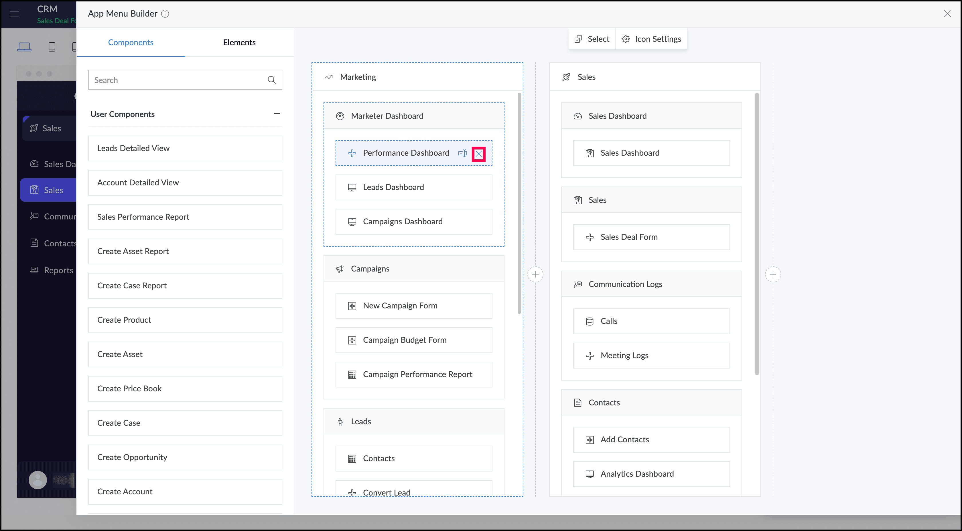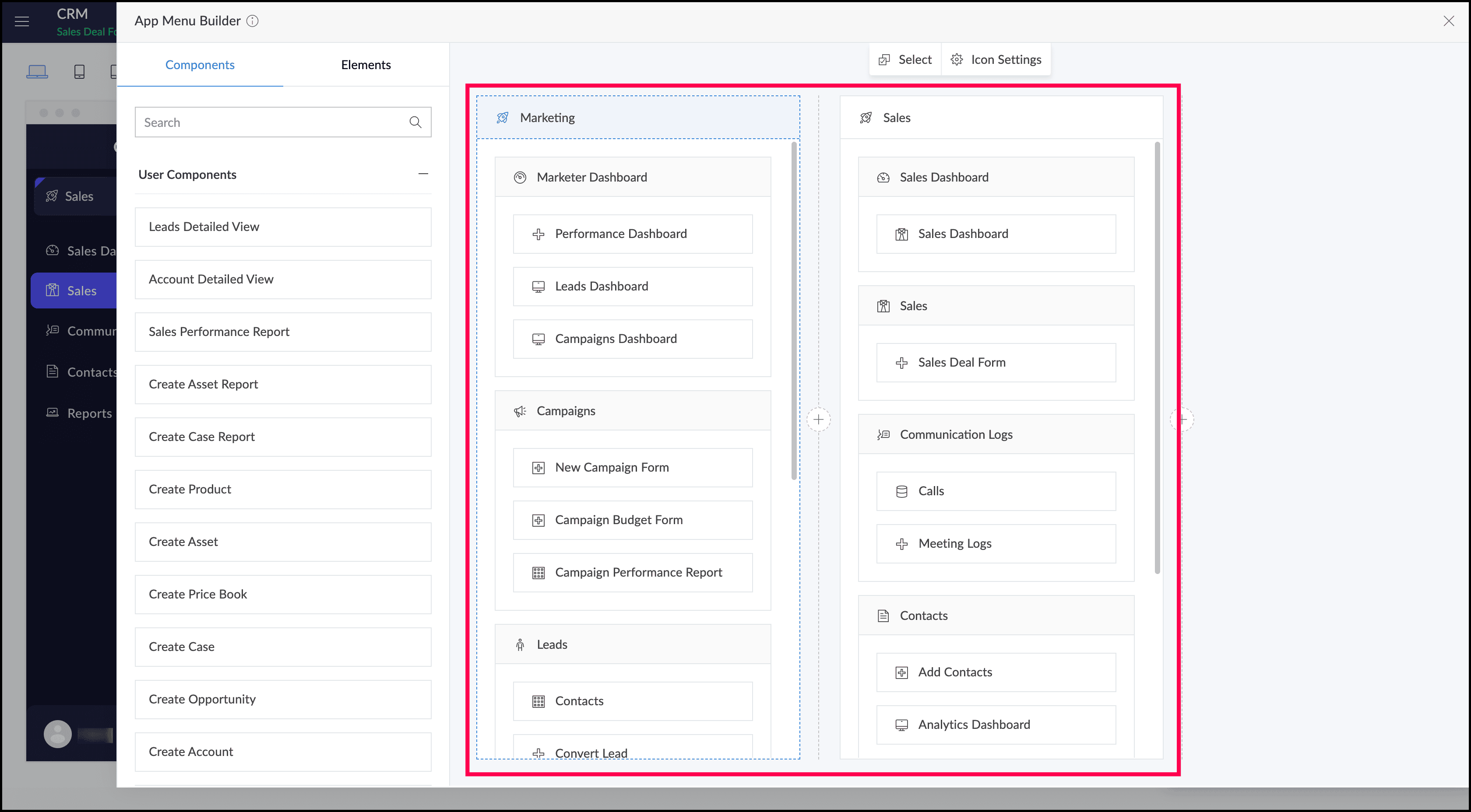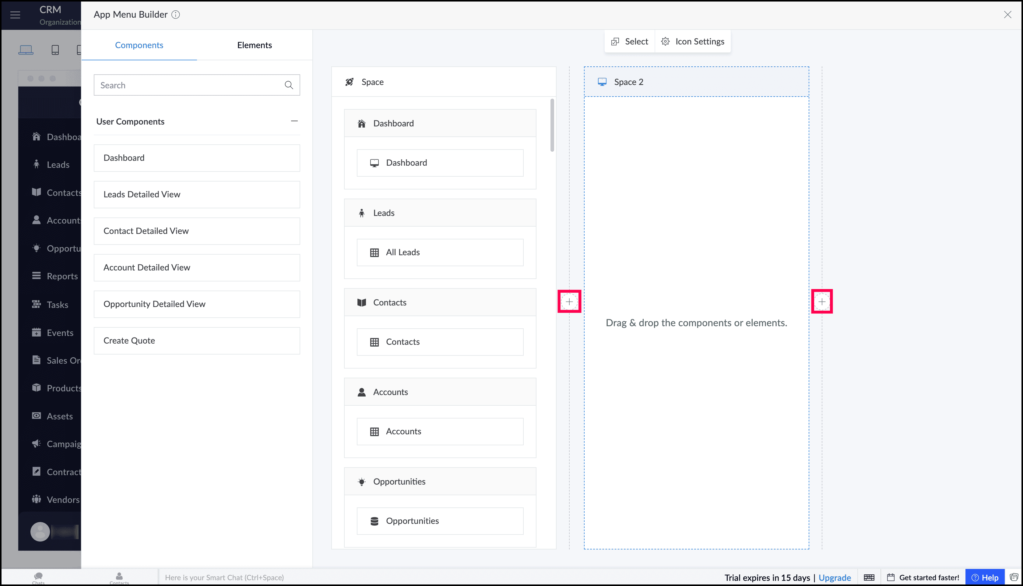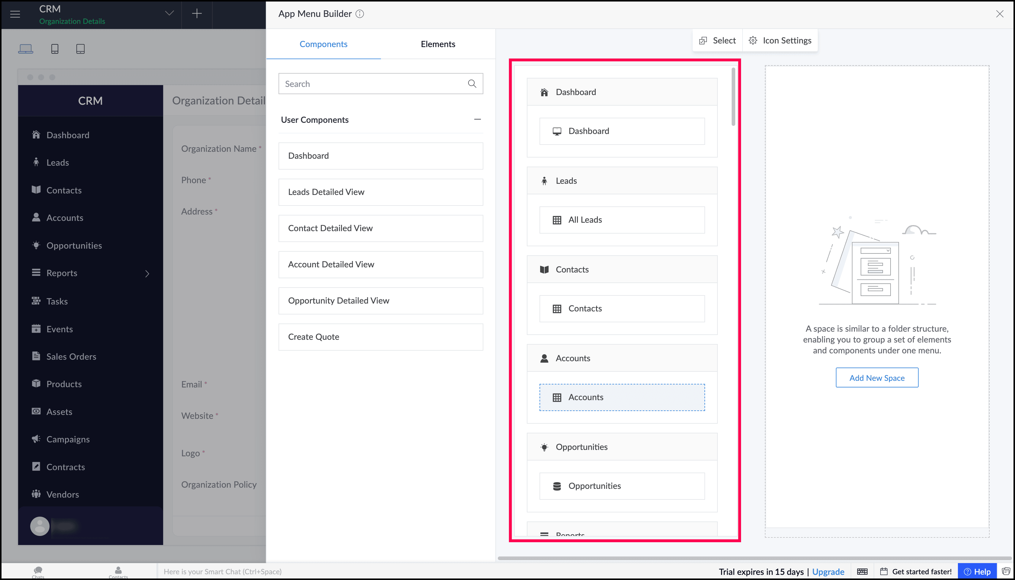 By default, components in your application will be arranged automatically. When a component is removed from a space, it will be listed under the Components section in the left pane of the app menu builder. You can customize your app menu by dragging and dropping the applications components and elements into the app menu space as shown.