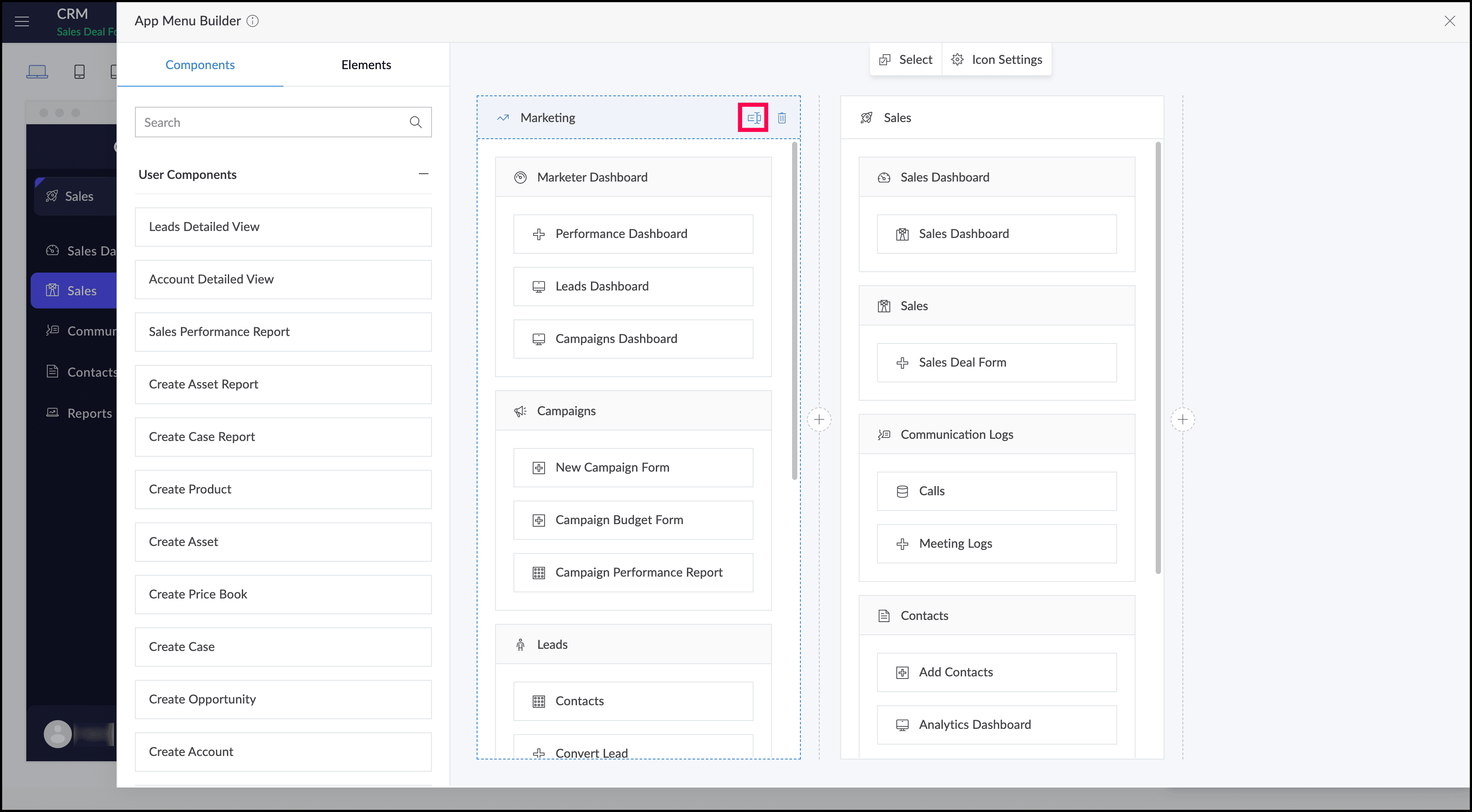 4. Click the app menu Icon in the top-right corner to access the app menu builder.