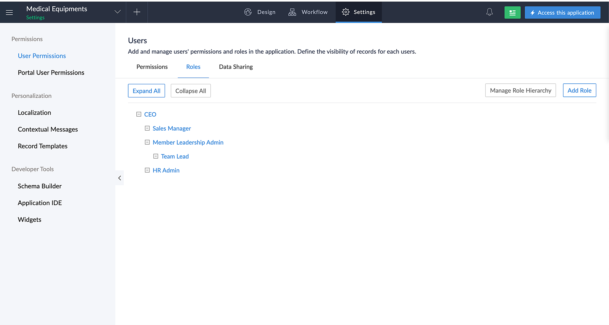 Roles tab is clicked, a screen appears from where you can view roles, add more of them, and manage role hierarchy.