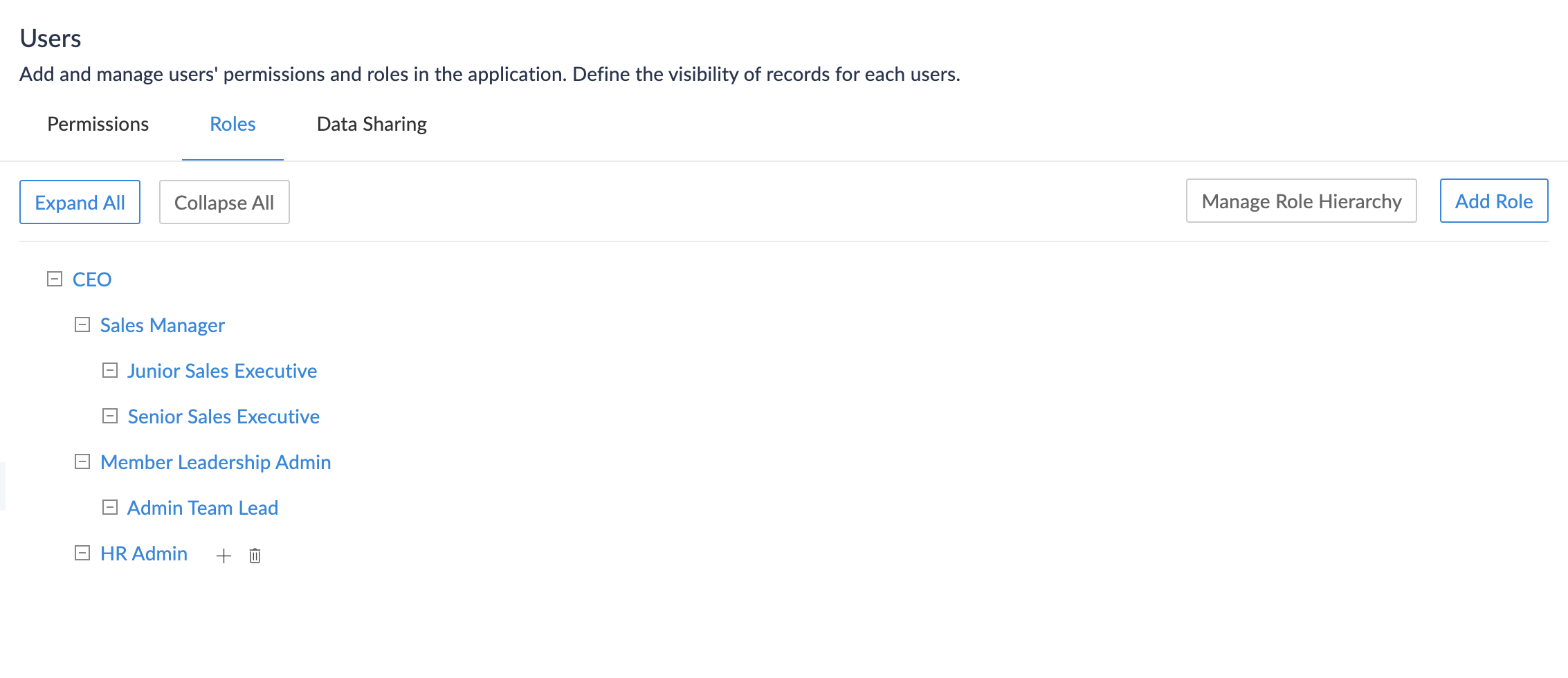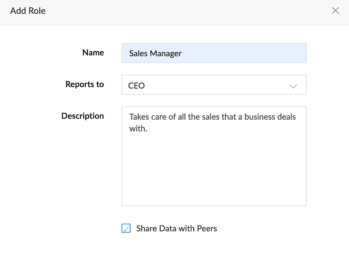 Share Data with Peers option enabled during the creation of these roles ensures that the users of the same role can view records added by each other. By enabling role hierarchy, the senior sales executives will be able to view the records added by the junior sales executives since the former stand higher in the role hierarchy.
