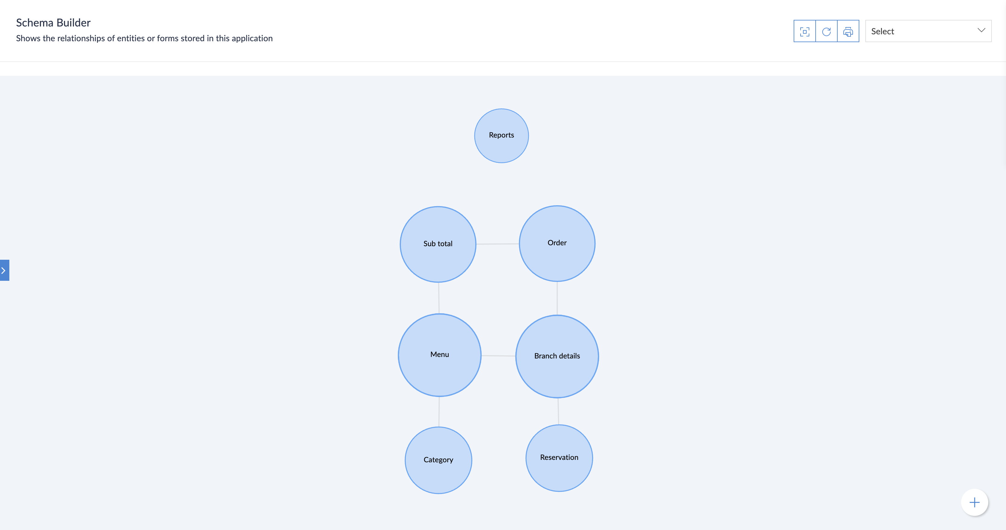 In Zoho Creator, a relationship diagram displays the structure of an application in terms of forms (with their fields), and the relationship between related forms. The following image illustrates a sample relationship diagram in Zoho Creator. Forms Sub total, Order, Menu, and Branch details are all related, while Form Reports is a standalone form.