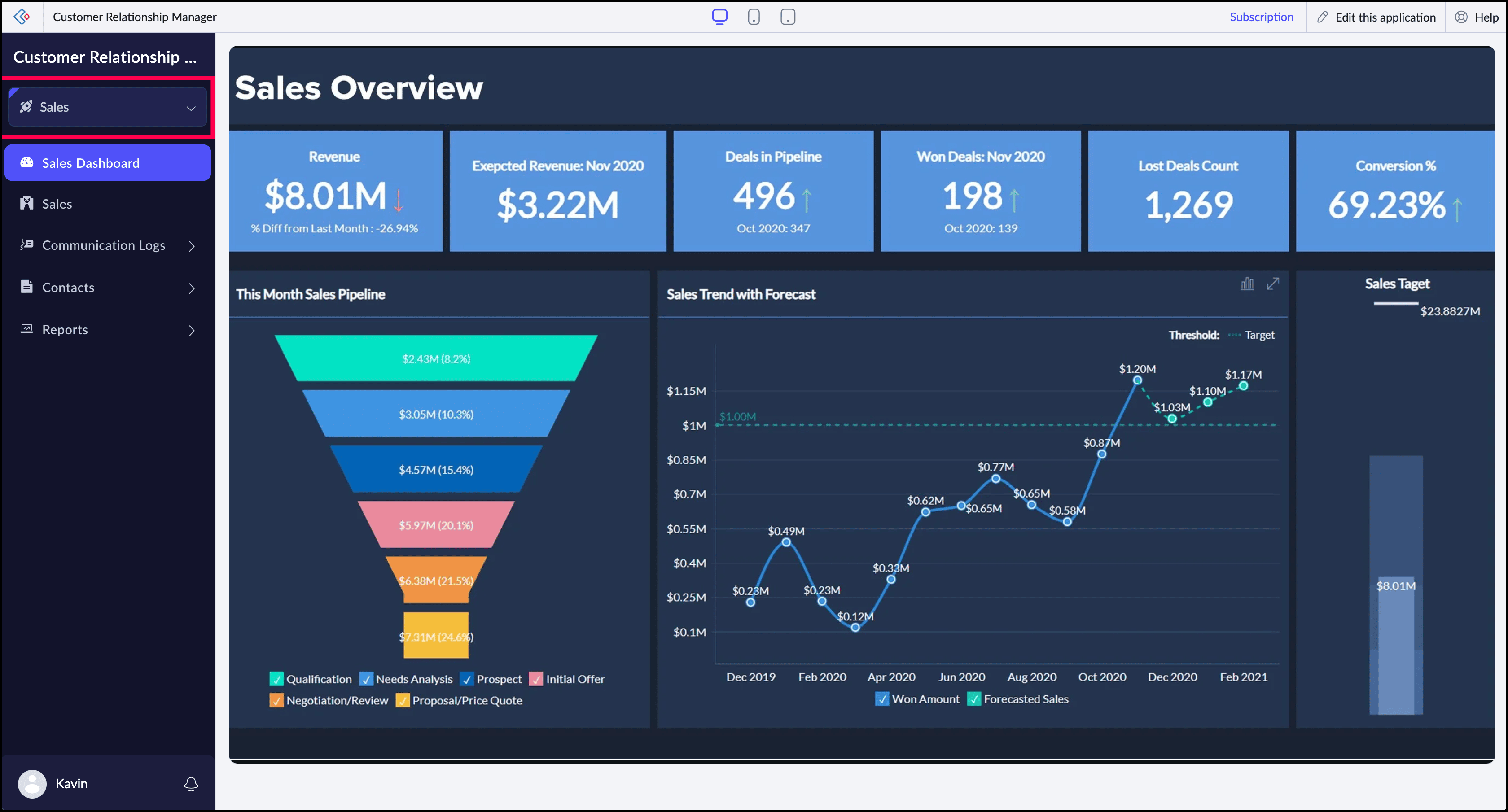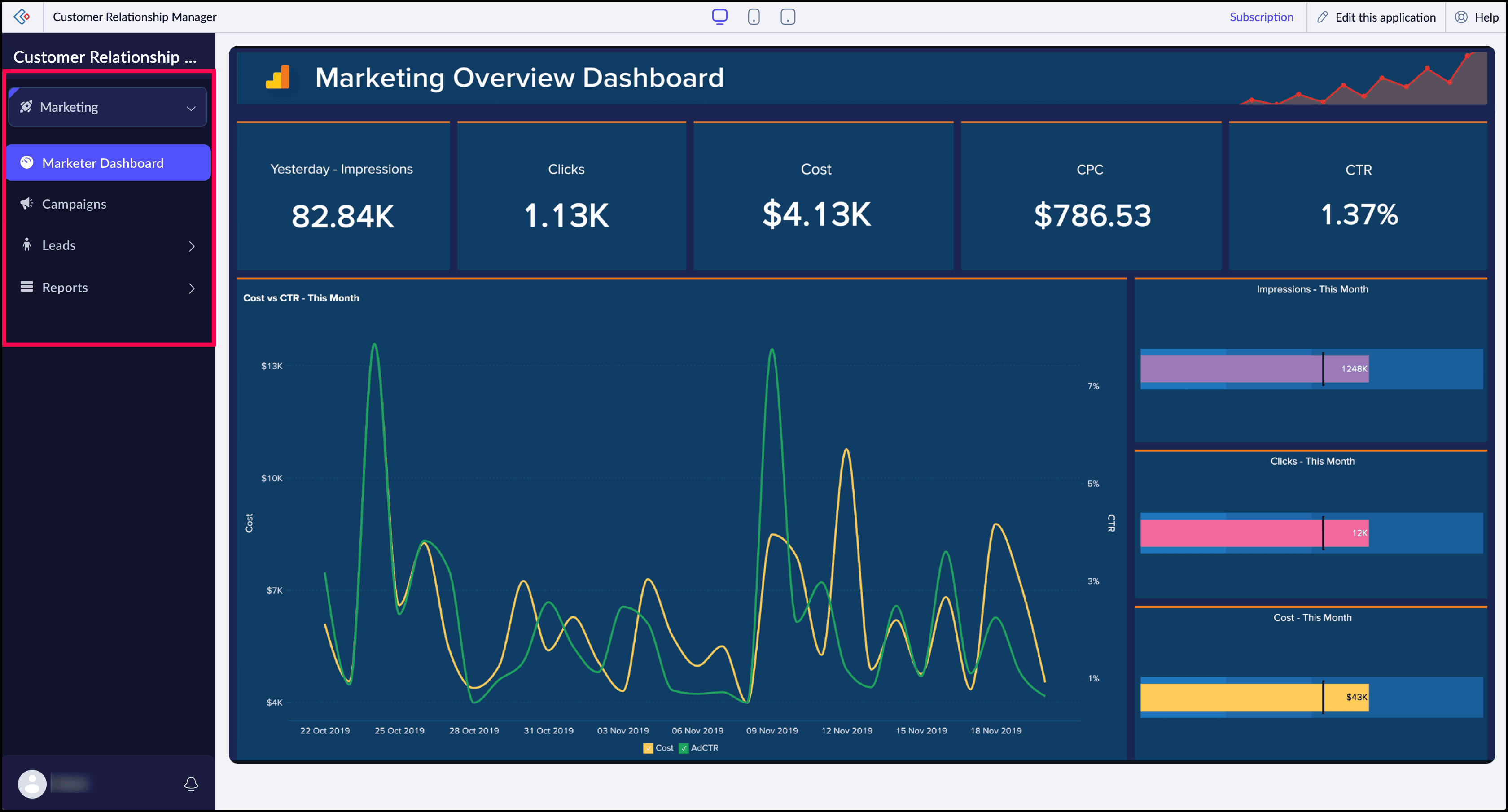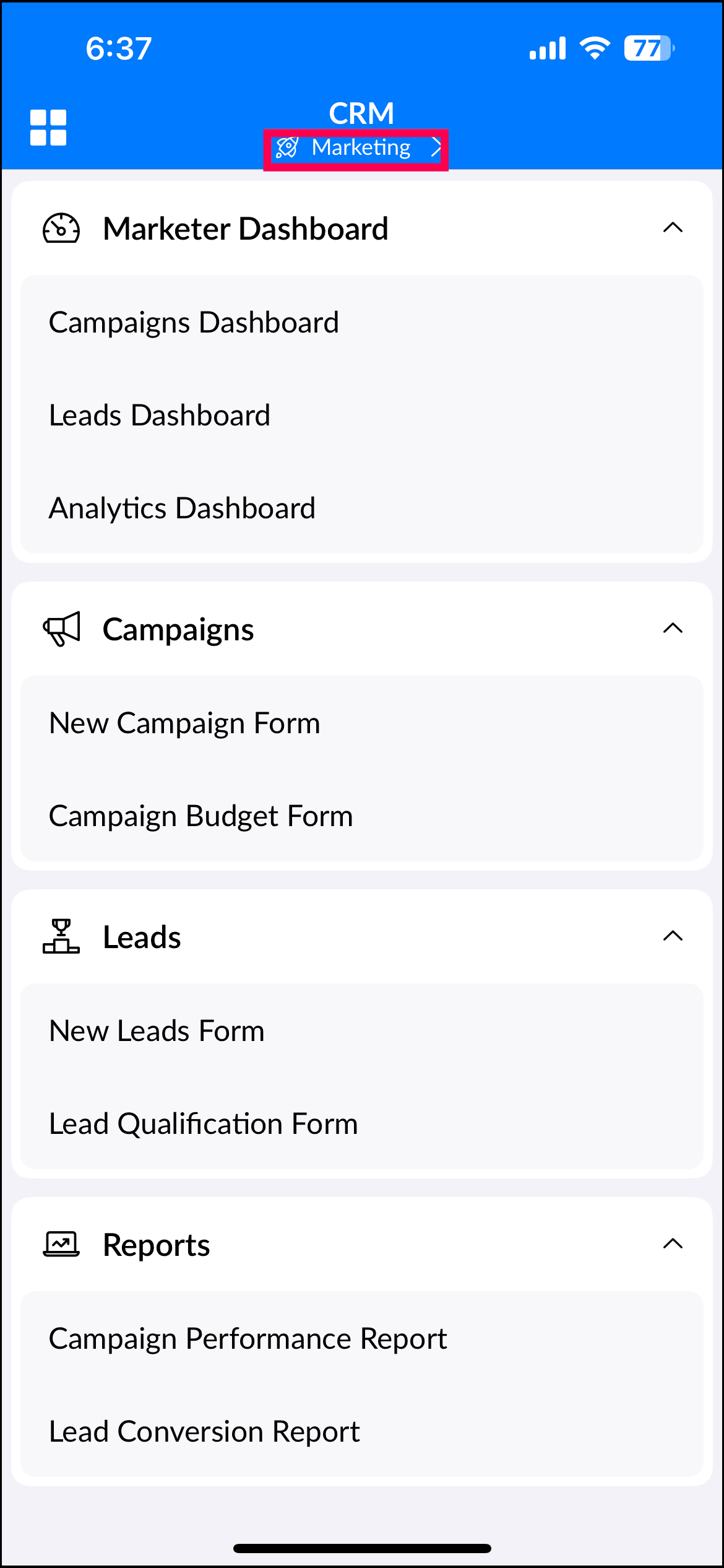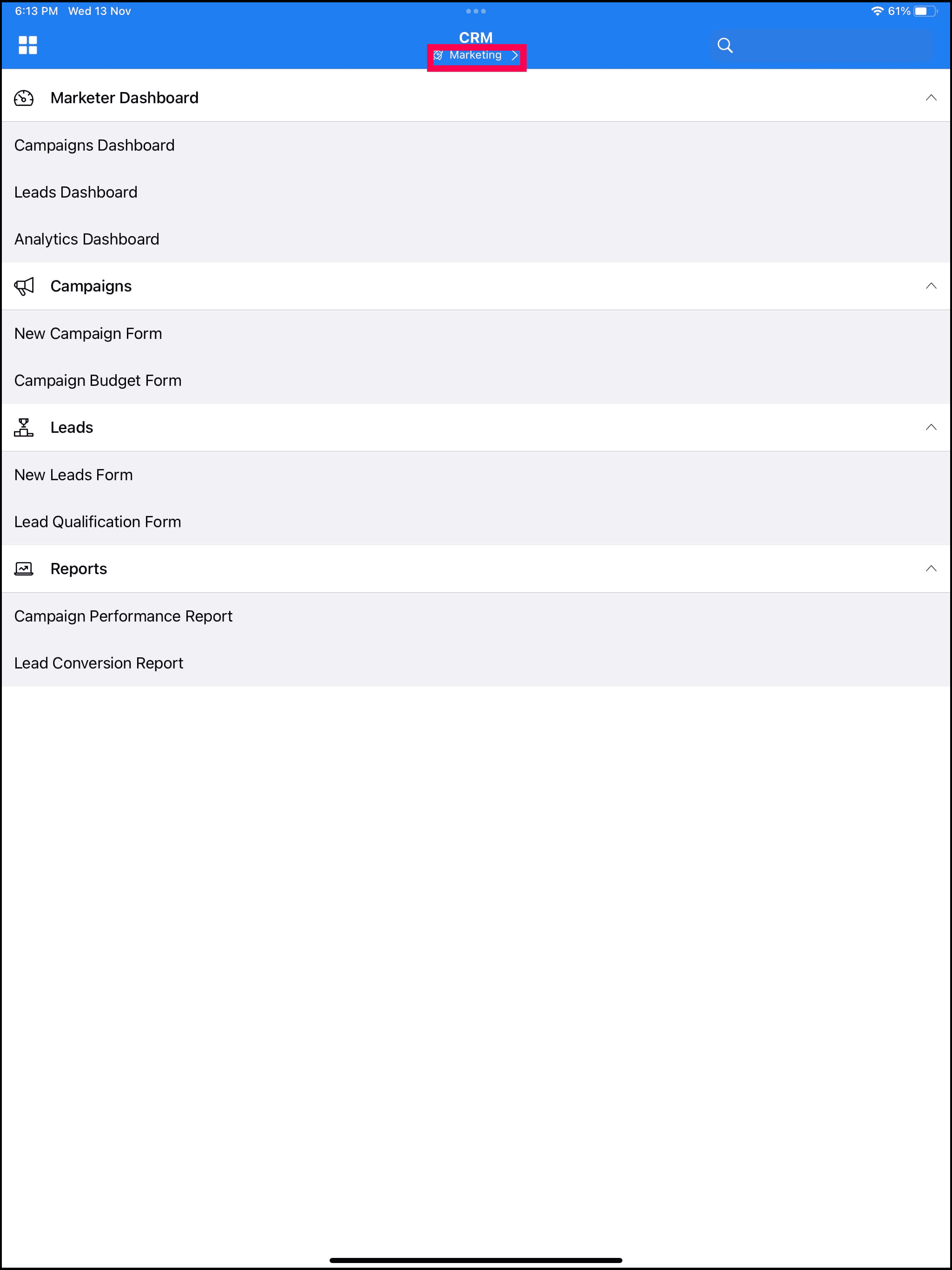 The respective user can access the Marketing or Sales pace to view the menu related to them, focusing only on their work modules. The final view of the app menu in the live mode for the example mentioned is shown below.