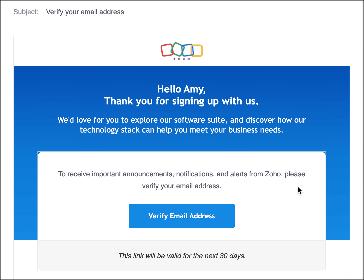 When you sign up, Zoho sends a verification email to your registered email address. Until the account is verified, certain features, such as sending emails, user addition, portal and account user API, remain restricted. Verifying your account promptly ensures uninterrupted access.