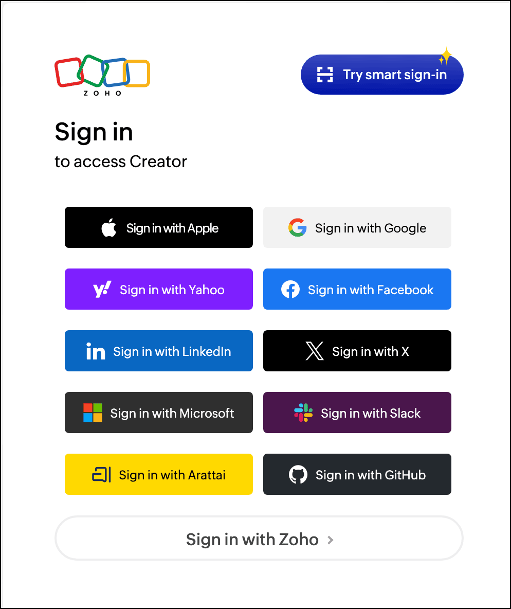 - Visit the Zoho Creator Sign in page. Click your preferred service under Sign in using.