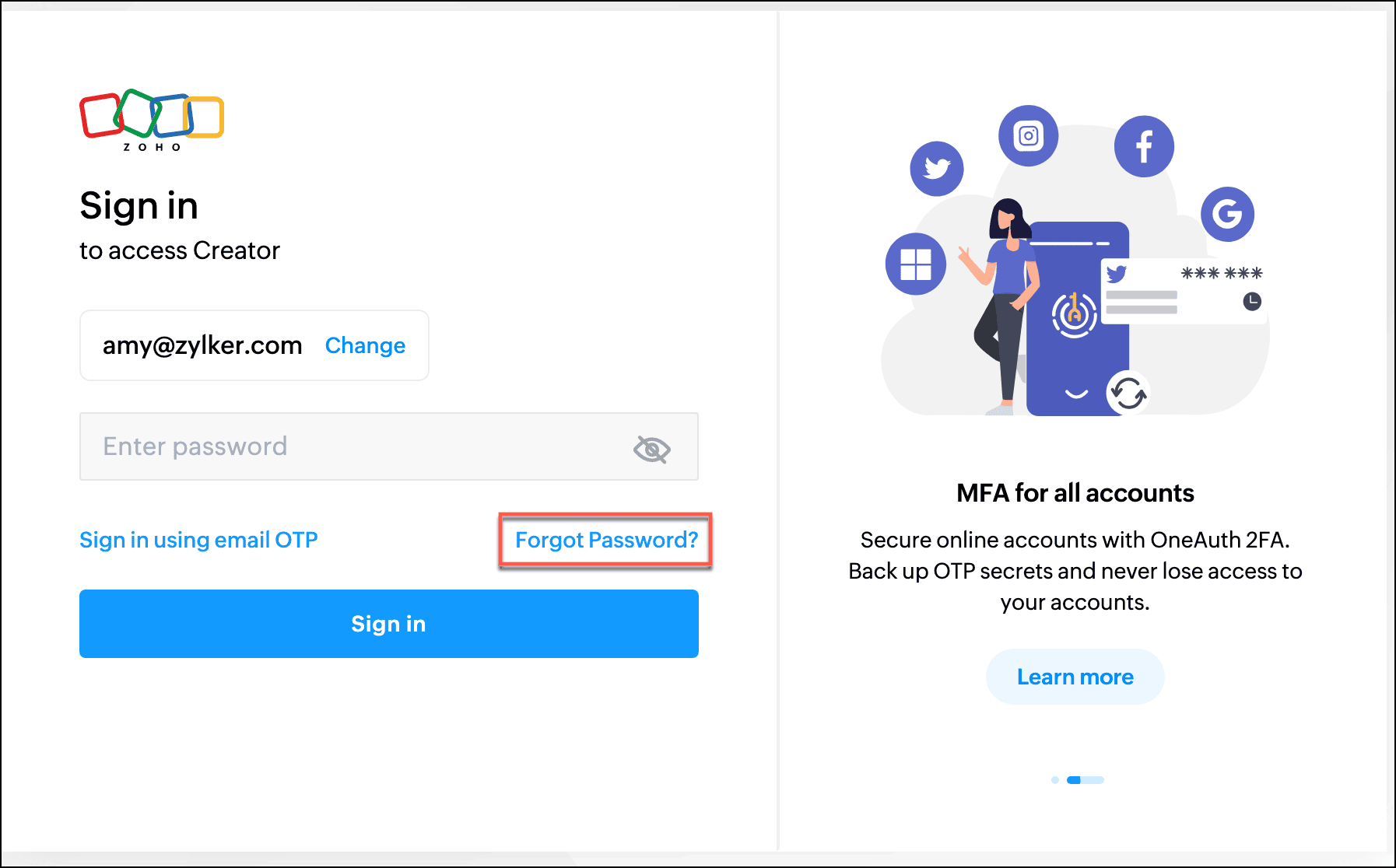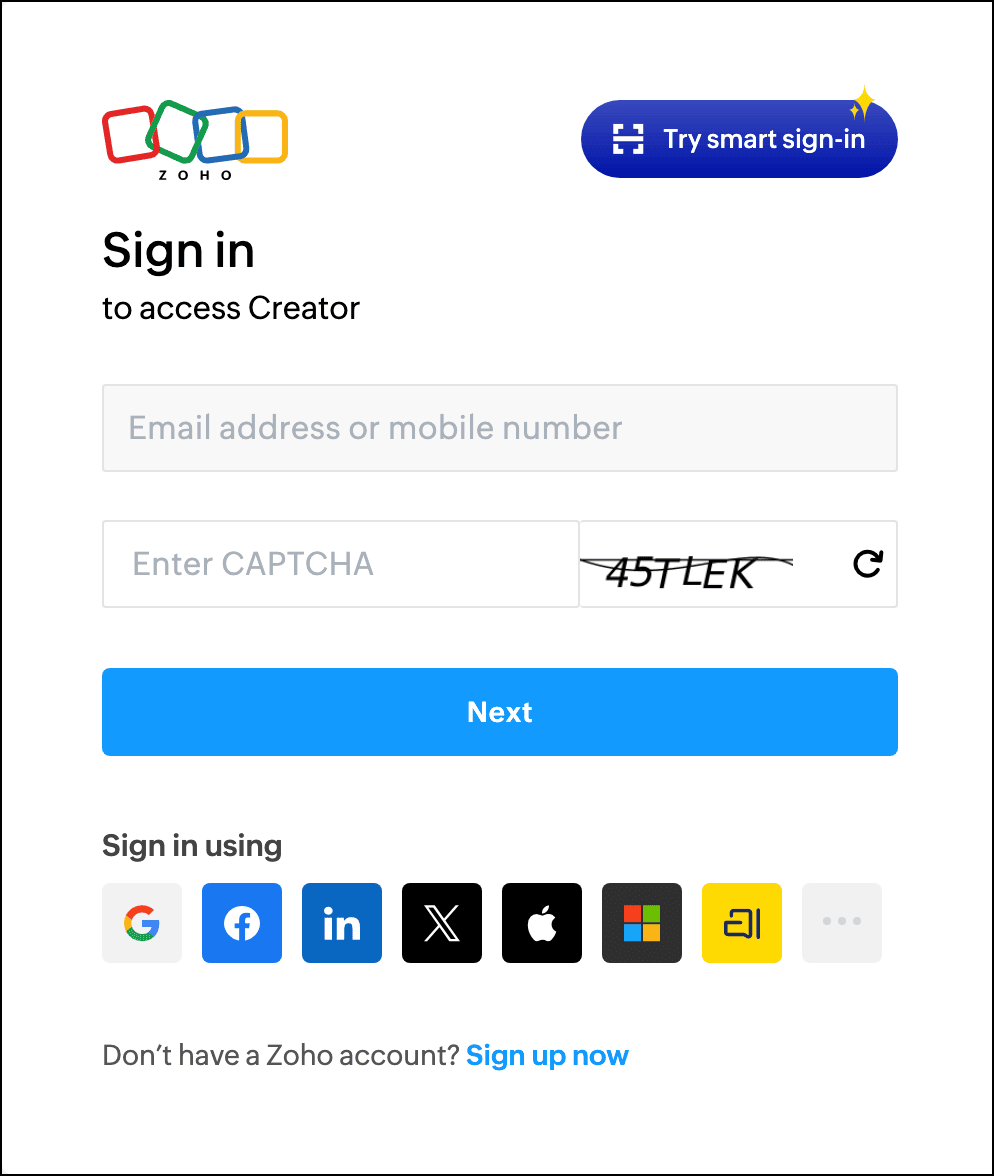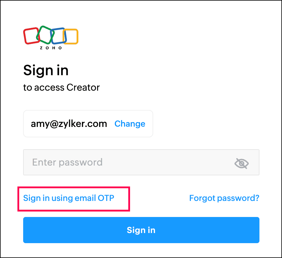 - Visit the Zoho Creator Sign in page.