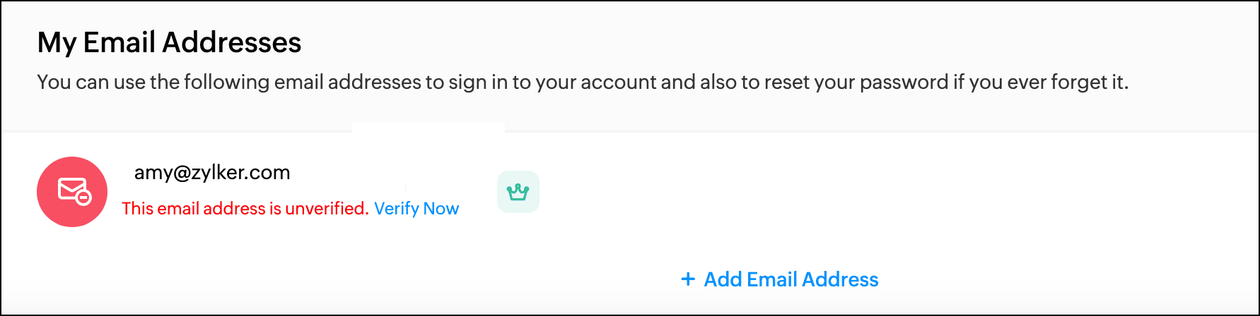 - On the My Email Addresses page, the email address that is not yet verified will have a Verify now button next to it.