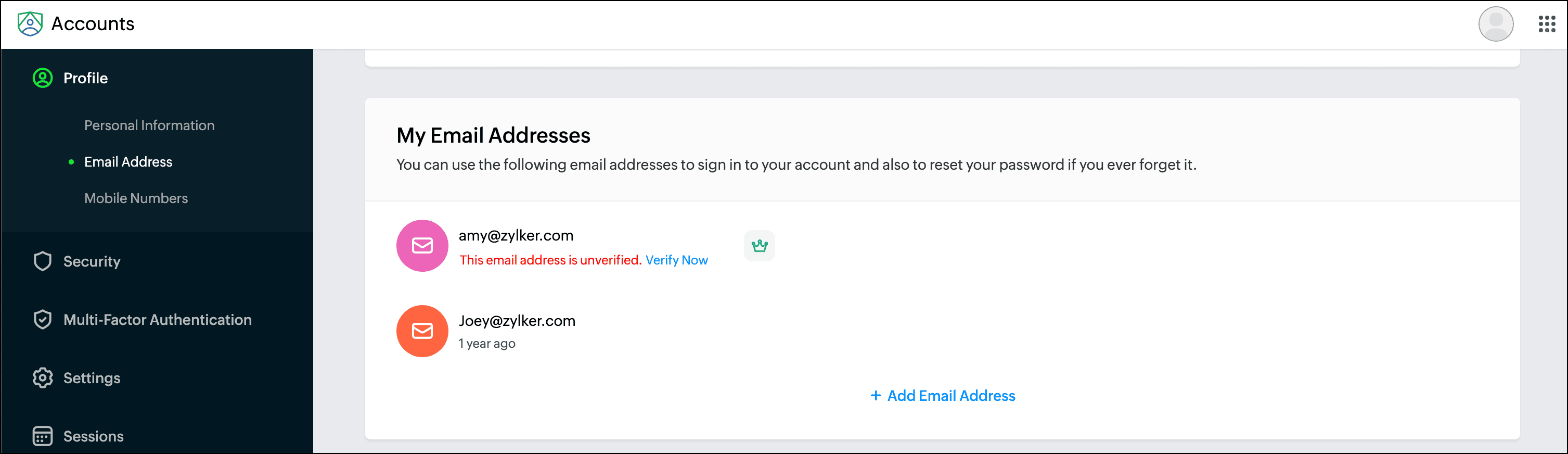Note: The base URL may vary based on your DC. - In the Zoho Accounts page, click My Profile Info > Email Address.