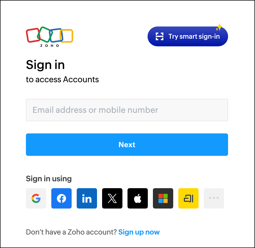 Smart Sign-In provides a secure, password-less way to access your Zoho account using the Zoho OneAuth mobile app. This method helps protect against phishing attempts by eliminating the need to enter passwords.