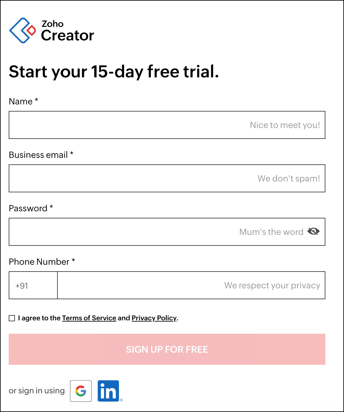 Signing up with Zoho Creator is the first step for users who are new to Zoho and do not have an existing account. You can sign up by giving your credentials and creating a password for your account or using your