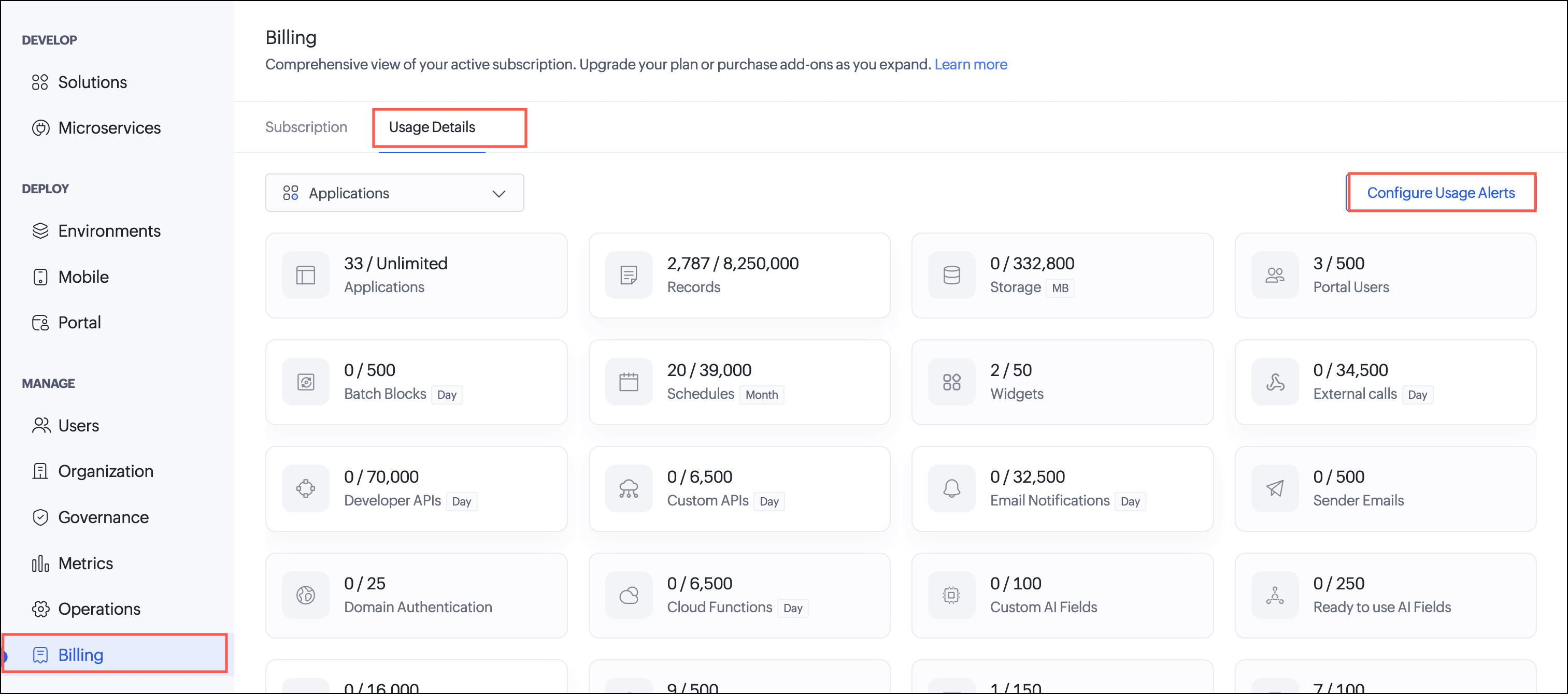 - Navigate to Configure Usage Alerts under Usage Details in the Billing tab.