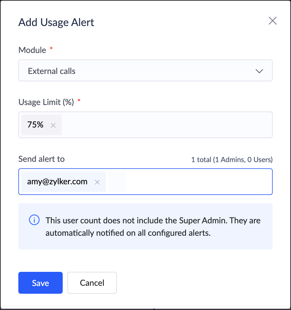 - Choose the Module, set the Usage Limit (%), and select the email addresses of users who should receive the alerts.